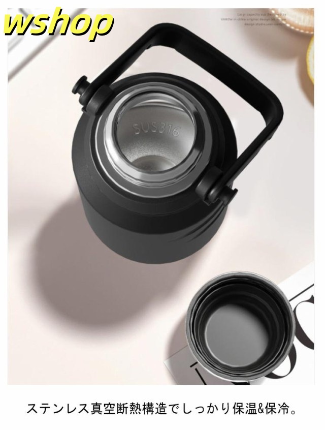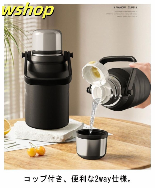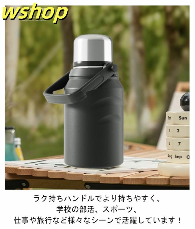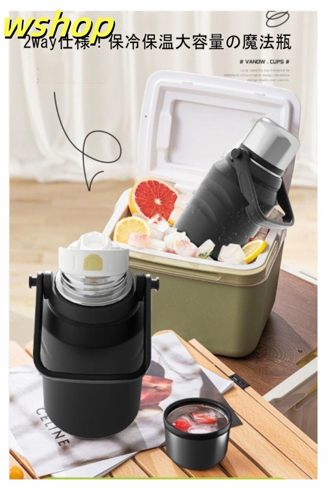 | 2way仕様!保冷保温大容量の魔法瓶 お茶や水だけでなくスポーツドリンクも入れることができます。 コップ付き、便利な2way仕様。 ステンレス真空断熱構造でしっかり保温&保冷。 茶こしも付属されているので、お茶を楽しんでいる気分を味わえる。 ラク持ちハンドルでより持ちやすく、学校の部活、スポーツ、仕事や旅行など様々なシーンで活躍しています! | |