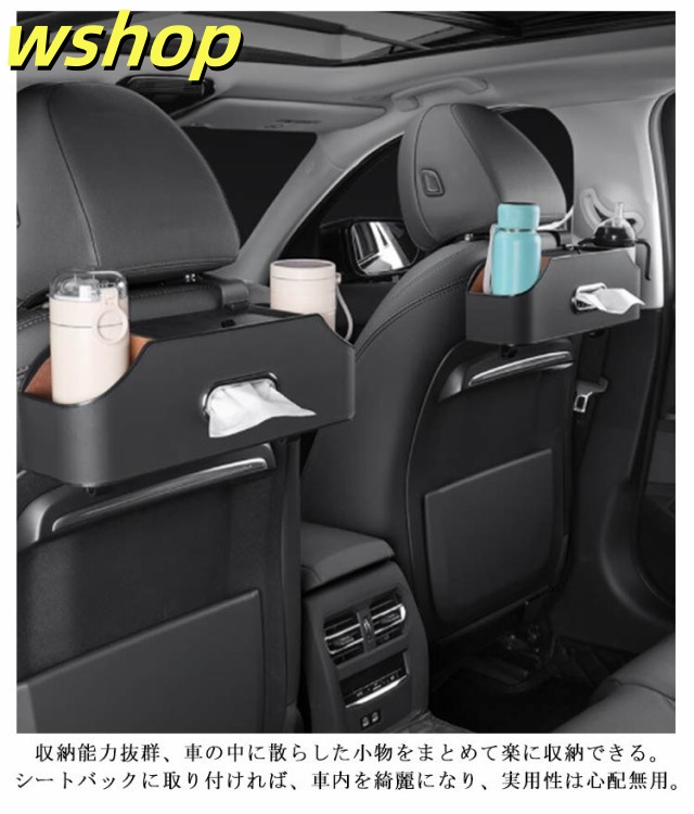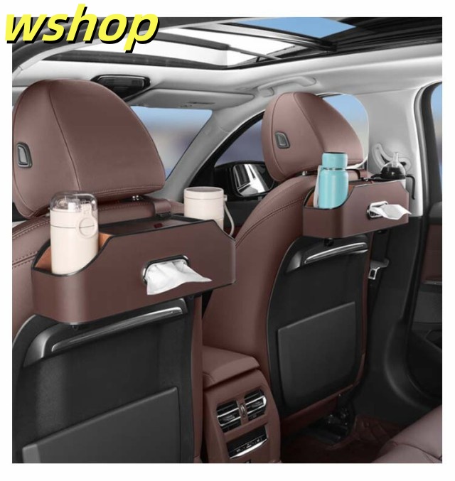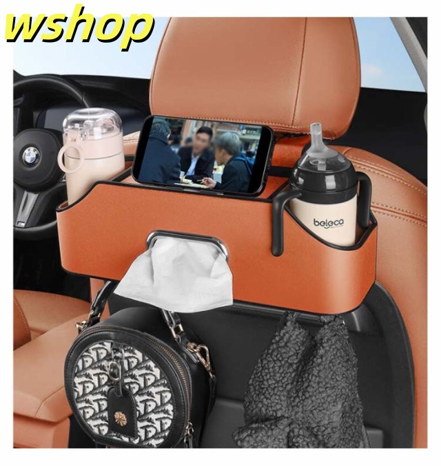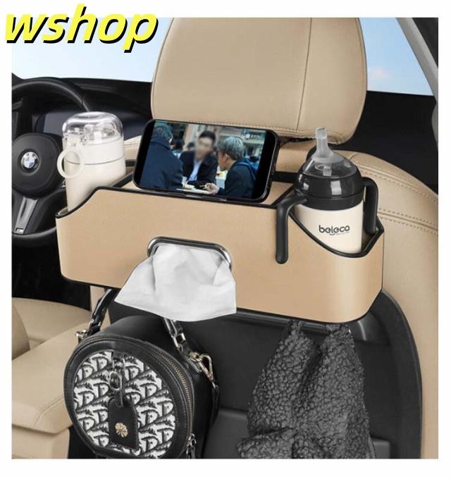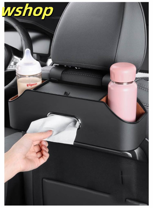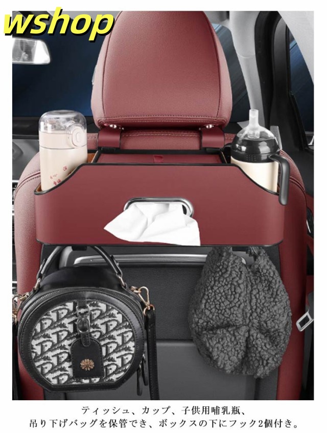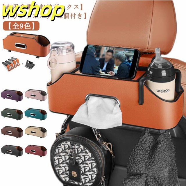 【wshop 】車用 ティッシュケース シートバックポケット 小物入れ ティッシュホルダー 車用収納ボックス ドリンクカップホルダー2個付き PUレザー 後部座席 収納バッグ ティッシュボックス 水筒/ボトル収納 防水防汚 耐摩耗 省スペース 吊り下げ 車載