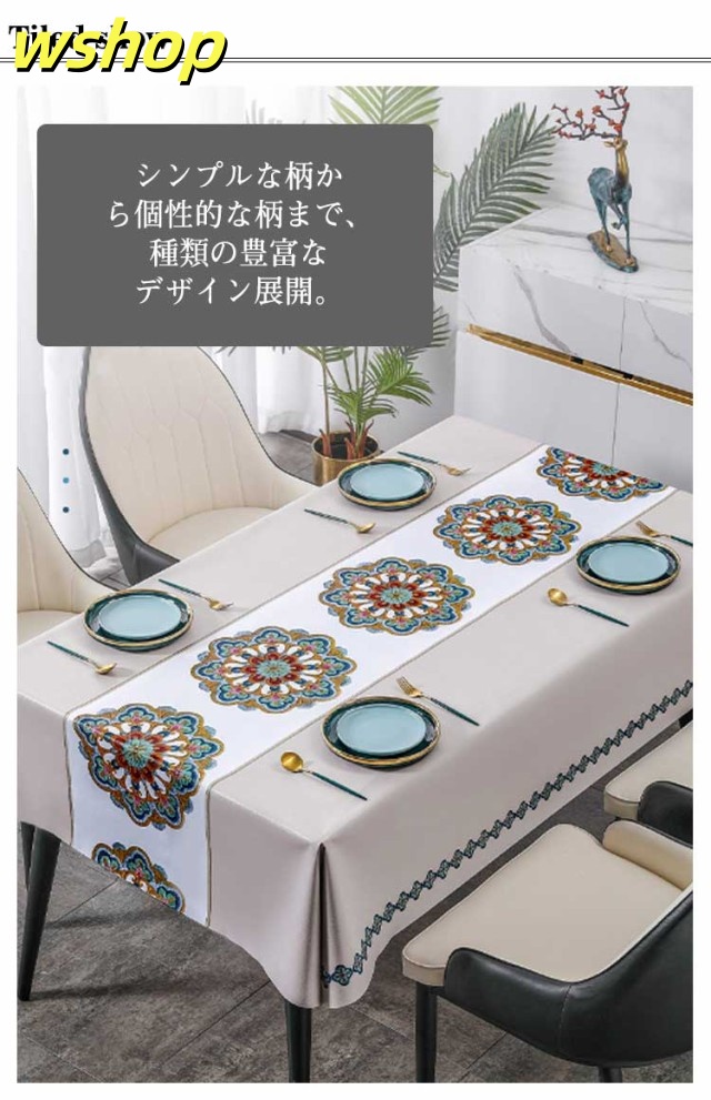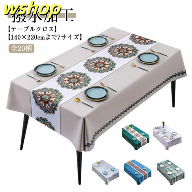 | 【全20柄】【140×220cmまで7サイズ】【テーブルクロス】【撥水加工】 シンプルな柄から個性的な柄まで、種類の豊富なデザイン展開。 主な素材にPVCを使用している為、軽くて防水防カビ性に優れて、洗濯の必要がありません。 水分を生地に浸み込まないので、食事を残した油汚れ、お醤油、スープなどの液体はすぐ拭けば簡単に拭きとることができます。 防水、防油、汚れ防止、浸透しにくい多機能テーブルクロスです。 シンプルなデザインであれば、事務机、学習テーブル等にも十分にご使用になれます。 季節やイベント、気分によって簡単に変えられるので、いつもの食卓がもっと楽しくなれます。 | |
