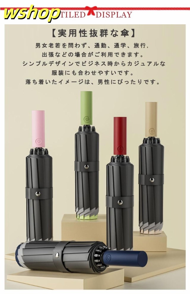 | 【濡れない逆さ折り式 】 濡れた面が内側に来るので、車内や衣服が水に濡れる心配がございません。電車で通勤、通学、車の乗り降り時も、他人に迷惑をかけません。 【超撥水&晴雨兼用】 高密度で防水性の高い布地を採用されたことにより、撥水性に優れています。 さらに、内側には遮光遮熱コーティングを施され、日差しの強い日は光を通さずUVカットしてくれるので、雨の日だけでなく、暑い季節の通勤に日傘としても活用可能。 【反射テープ付き折畳み傘】 暗い夜道でもドライバーの視認性を高めるために、傘のエッジ部分に反射材料で加工された折りたたみ傘です。 傘を持っても車から徒歩者の姿を見つけやすくなるので、大雨の日、霧の日、雨の夜でも安心・安全に歩けます。 【自動開き】 軽く押すと自動開閉できます。車を降りたり、子供を抱いたり、荷物を持っている時、折り畳み傘は最適です。 折りたたみ式なので出張、旅行の携帯用として、車の中に常備していると大変便利です。 【風に強い10本骨】 頑丈なアルミ合金とグラスファイバーで作られた10本骨折りたたみ傘です。柔軟性と強度を併せ、耐風性と耐久性ともに向上させた折り畳み傘です。 【実用性抜群な傘】 男女老若を問わず、通勤、通学、旅行,出張などの場合がご利用できます。 シンプルデザインでビジネス時からカジュアルな服装にも合わせやすいです。 落ち着いたイメージは、男性にぴったりです。 | |