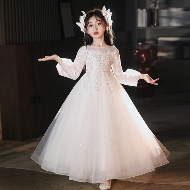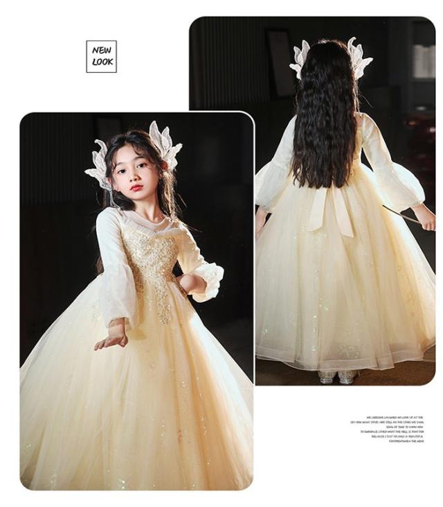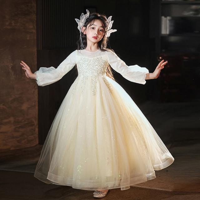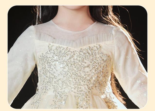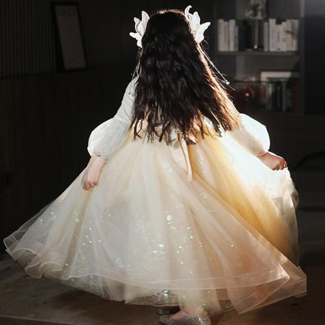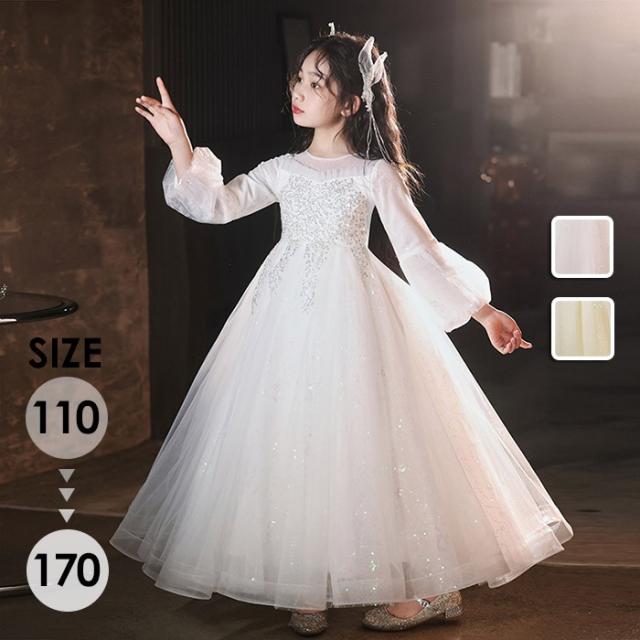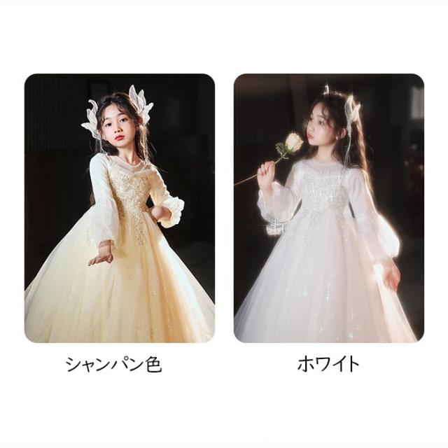 キッズドレス ロングドレス 子供用 長袖 キラキラ 小学生 ドレス ロング丈 春 秋 発表会 キッズ 中学生 演奏会 ピアノ発表会 パーティー ジュニア 110-170cm シャンパン色 ホワイト da011m6