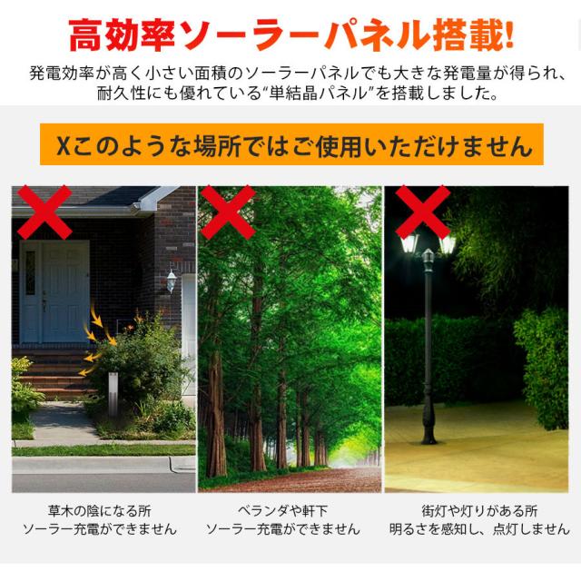 ライトの内部に光感知センサーがあるので、夜には強い灯りのある場所に設置しないでください。