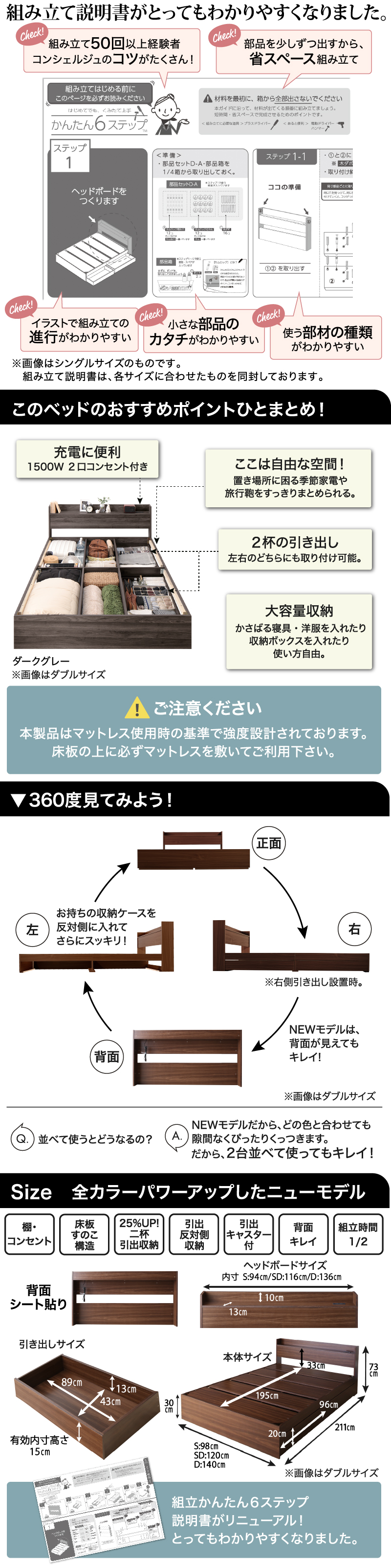 棚・コンセント付・引き出し付き天然木調ベッド!