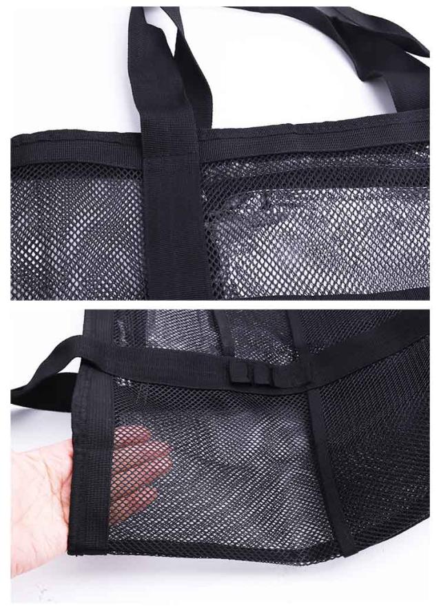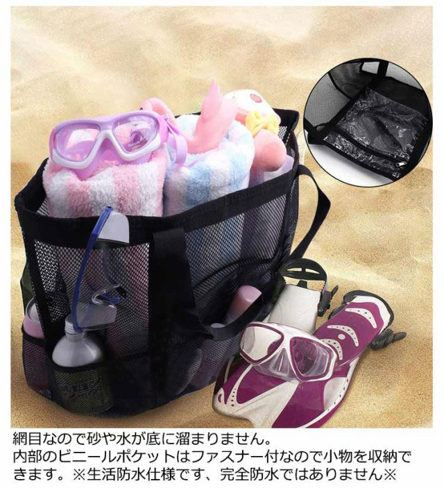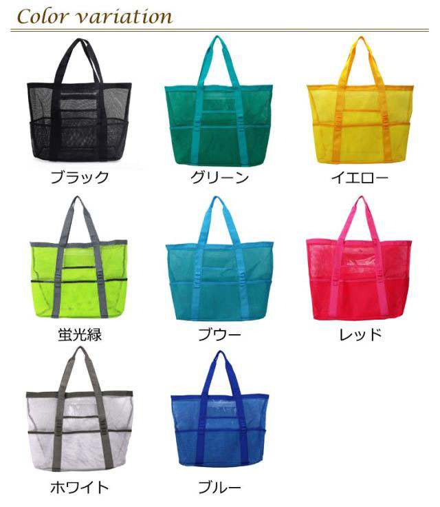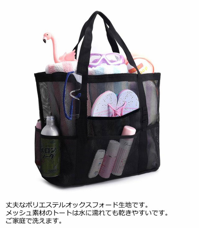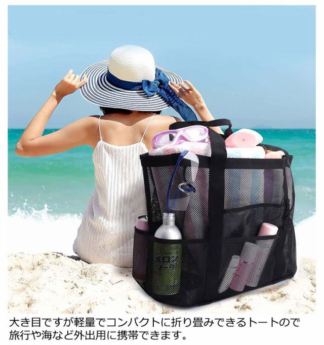 | 大容量のメッシュトートバッグです。砂場や海水浴、プール、温泉、ダイビングやお買い物、玩具入れに大活躍!通勤通学、ジム、旅行など荷物が多い時に便利なバッグです。 多ポケット、内部にファスナーポケットがあります。持ちやすいハンドルです。肩掛けもできる大型トートバッグです。 大き目ですが軽量でコンパクトに折り畳みできるトートので旅行や海など外出用に携帯できます。 網目なので砂や水が底に溜まりません。内部のビニールポケットはファスナー付なので小物を収納できます。※生活防水仕様です、完全防水ではありません※ 丈夫なポリエステルオックスフォード生地です。メッシュ素材のトートは水に濡れても乾きやすいです。ご家庭で洗えます。 | |