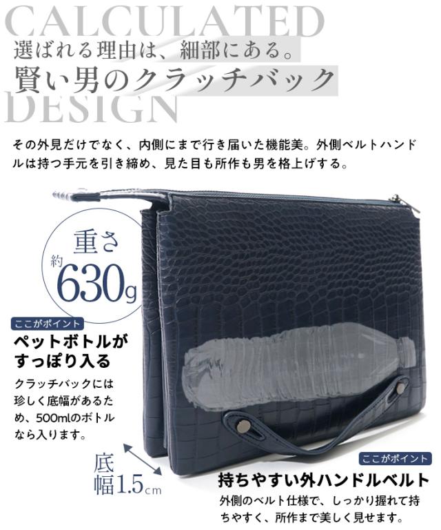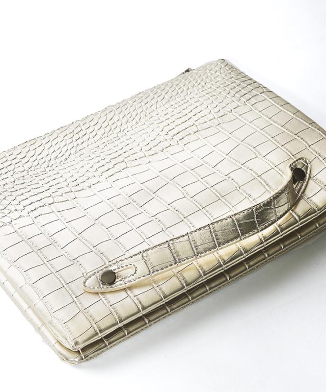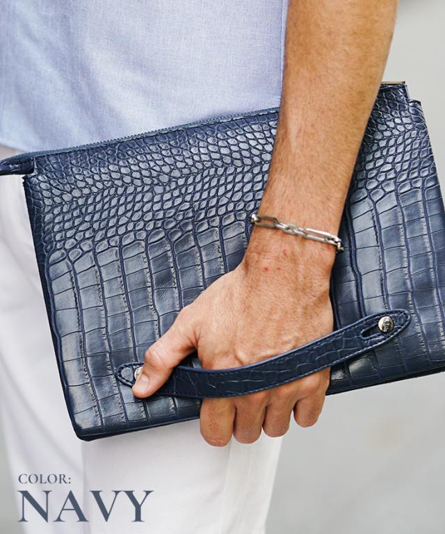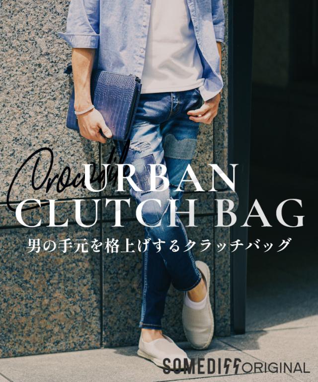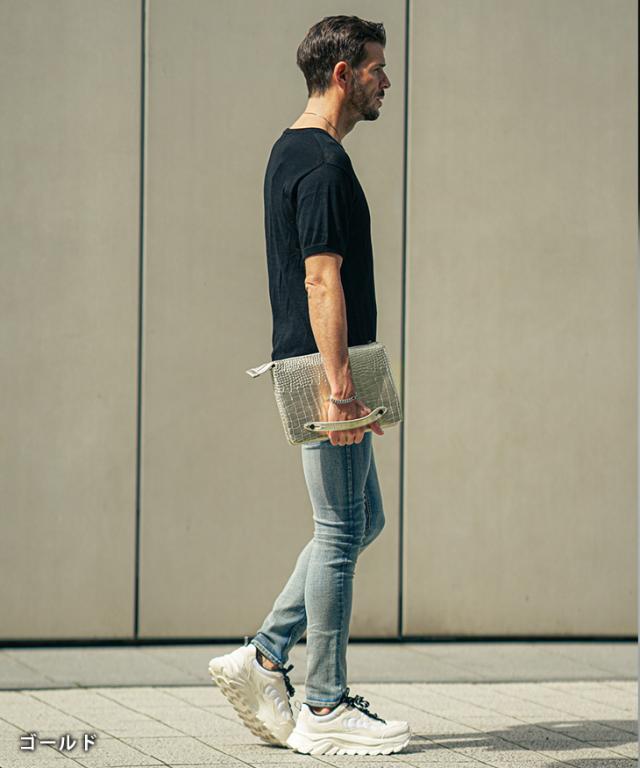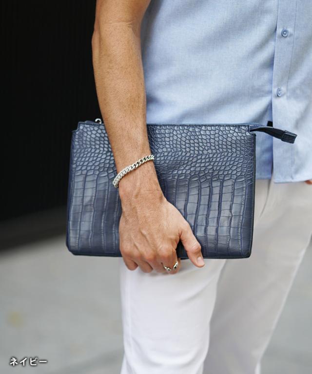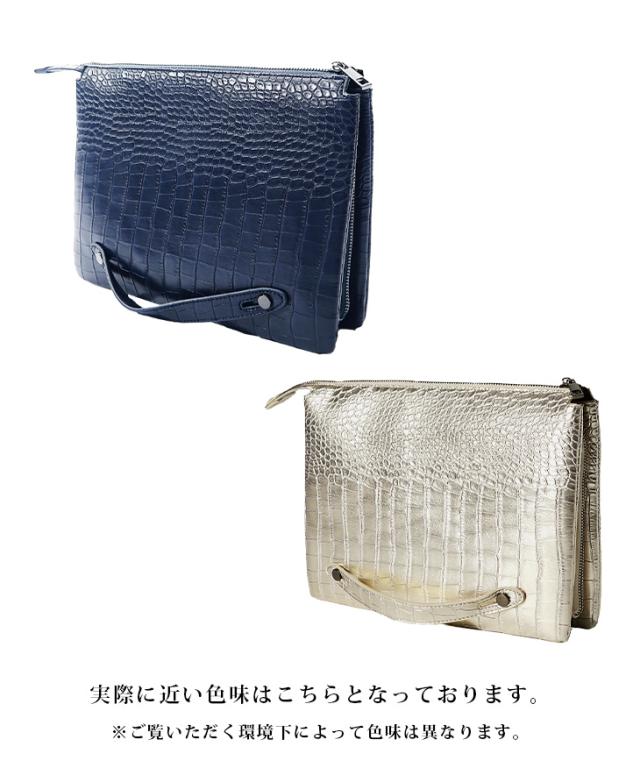 SOMEDIFF(サムディフ)『クロコクラッチバッグ』【クロコクラッチバッグ】■Design/デザイン大人の遊び心溢れるクロコデザインが特徴的なクラッチバッグ。大小異なるクロコ柄を用いることで、違いが生まれる見た目に。また、裏地には光沢感のあるストライプ柄を採用し、抜け目のない拘りを感じさせるアイテム。大人の深みを漢字させるネイビーと、輝きのある色気を演出するゴールドの2色展開。リッチな刺激でお出掛けに華を添える。