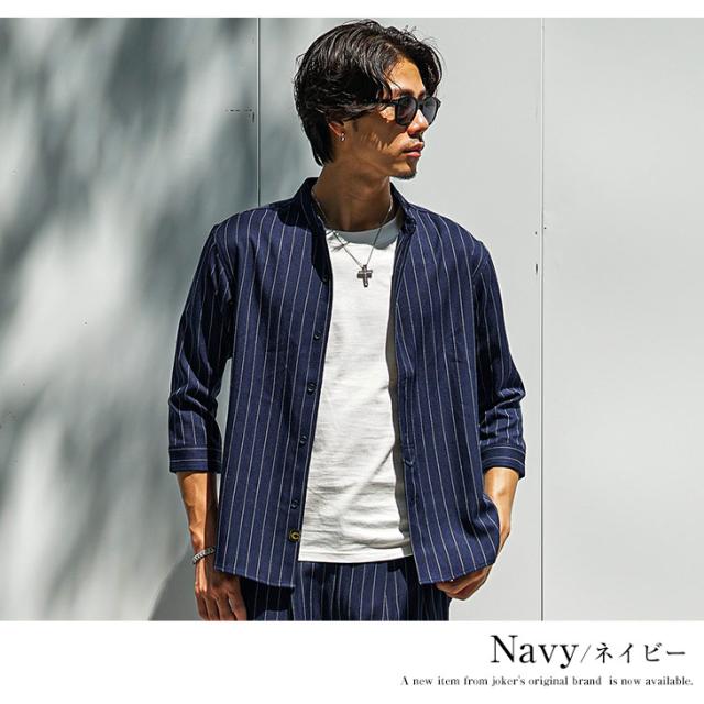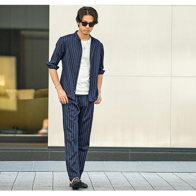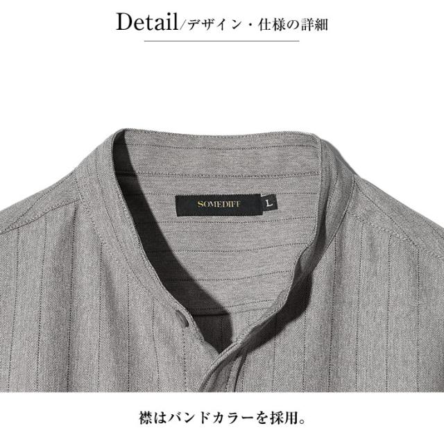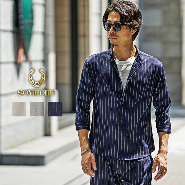 SOMEDIFF (サムディフ) 『バンドカラー7分袖シャツ』【レギュラーカラー長袖シャツ】■Design/デザイン縦のストライプ柄が特徴的なバンドカラーの7分袖シャツ。目を惹くストライプデザインだけでなく、着やすさや細部にもこだわりをもたせた一枚。ポリエステルを使用した生地により、薄手の生地でも強度があるため、軽くて通気性があるのもポイント。だらしなしくなりがちなシャツのシワも軽減したシワになりにくい生地なので、洗ってすぐ着れる簡単ケアも実現。フロントのボタン下にはSOMEDIEFのブランドタグを配置し細かなこだわりを魅せる。軽妙で品格溢れる夏STYLEを楽しめ。■Material/素材感生地はポリエステルやポリウレタンなどを使用。心地よいなめらかな手触りで、爽やかに着こなせる。