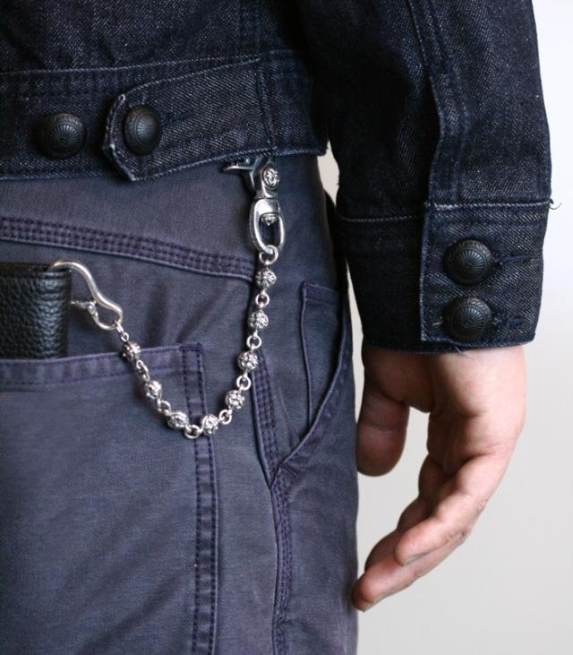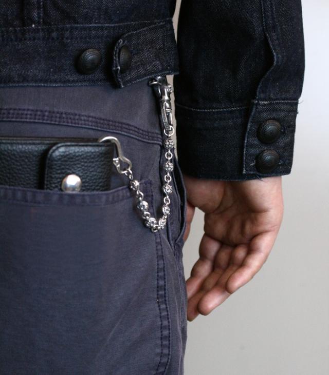 通常のよりも短いチェーンは、パンツのサイドループに取り付けるタイプで主張しすぎないスタイルがさりげなく品のある着用が楽しめます。