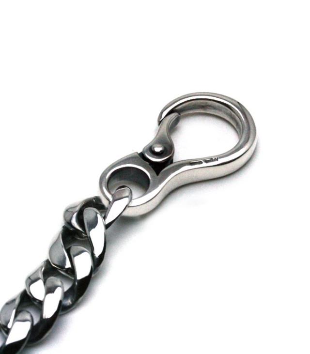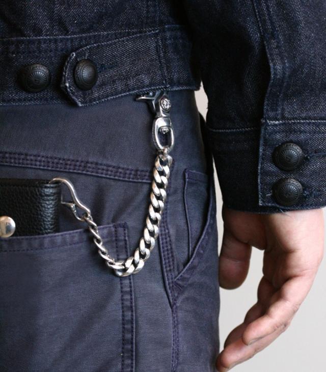 通常のよりも短いウォレットチェーンは、パンツのサイドループに取り付けるタイプで主張しすぎず、さりげなくスーツスタイルにも違和感無く溶け込むラグジュアリーな大人アイテムです。