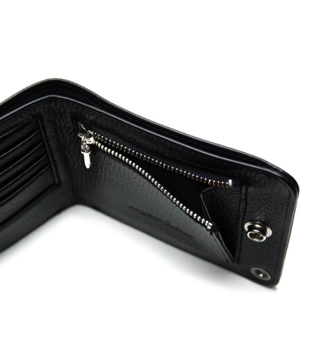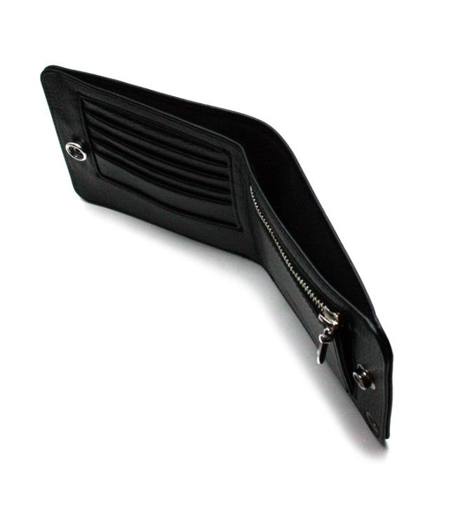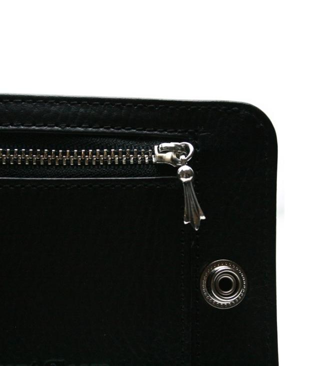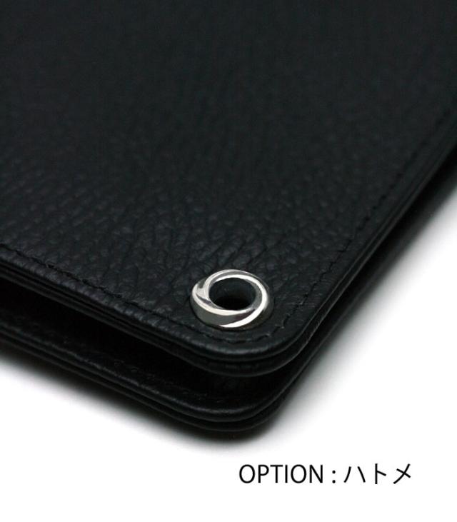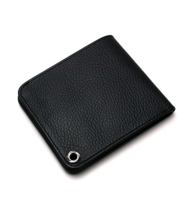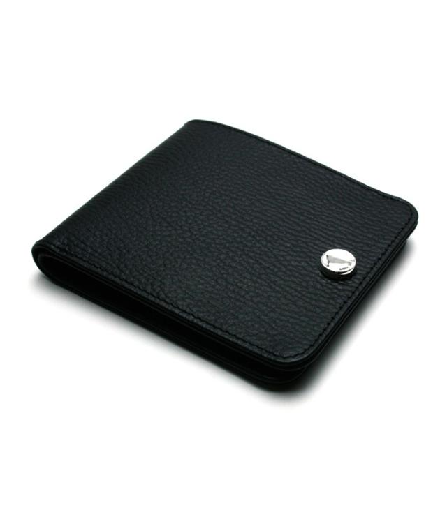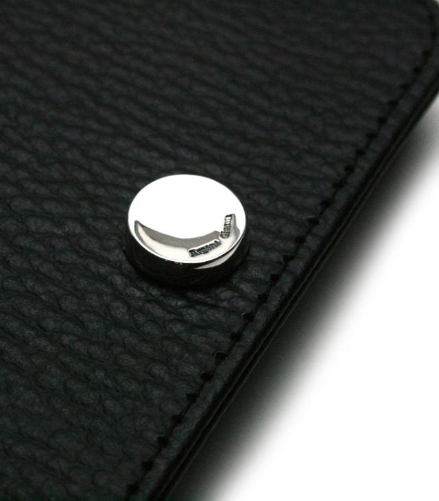 上品なシボ柄が特徴の厳選した上質なカウレザーのウォレットは、シルバーボタンとの相性を最大限に引き出すため革のフィニッシュにこだわり程よい半艶のマットブラックに仕立て上げられています。