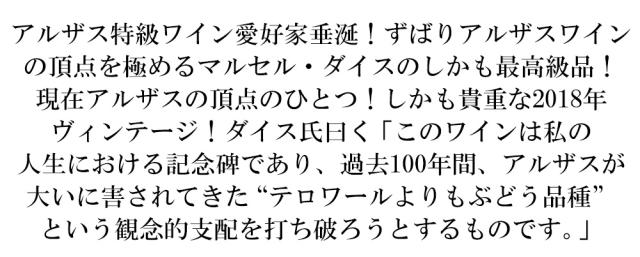 アルザス特級ワイン愛好家垂涎!ずばりアルザスワイン の頂点を極めるマルセル・ダイスのしかも最高級品! 現在アルザスの頂点のひとつ!しかも貴重な2018年 ヴィンテージ!ダイス氏曰く「このワインは私の 人生における記念碑であり、過去100年間、アルザスが 大いに害されてきた“テロワールよりもぶどう品種” という観念的支配を打ち破ろうとするものです。」