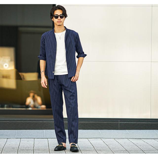 SOMEDIFF (サムディフ) 『テーパードスラックス』【テーパードスラックス】■Design/デザイン縦のストライプ柄が特徴的なテーパードタイプのスラックス目を惹くストライプデザインだけでなく、着やすさや細部にもこだわりをもたせた一枚。ポリエステルを使用した生地により、薄手の生地でも強度があるため、軽くて通気性があるのもポイント。だらしなしくなりがちなスラックスのシワも軽減したシワになりにくい生地なので、洗ってすぐ着れる簡単ケアも実現。バックの右ポケットにはSOMEDIEFのブランドタグを配置し細かなこだわりを魅せる。軽妙で品格溢れる夏STYLEを楽しめ。■Material/素材感生地はポリエステルやポリウレタンなどを使用。心地よいなめらかな手触りで、爽やかに着こなせる。