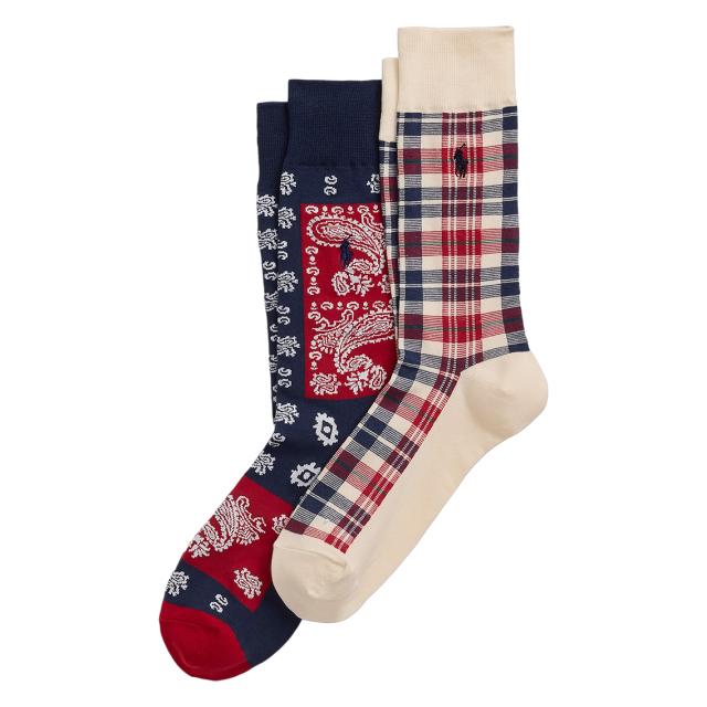 2足セットのトラウザーソックス。1足にはバンダナ柄のパッチワーク風モチーフ、もう1足にはクラシックなチェック柄がデザインされています。
