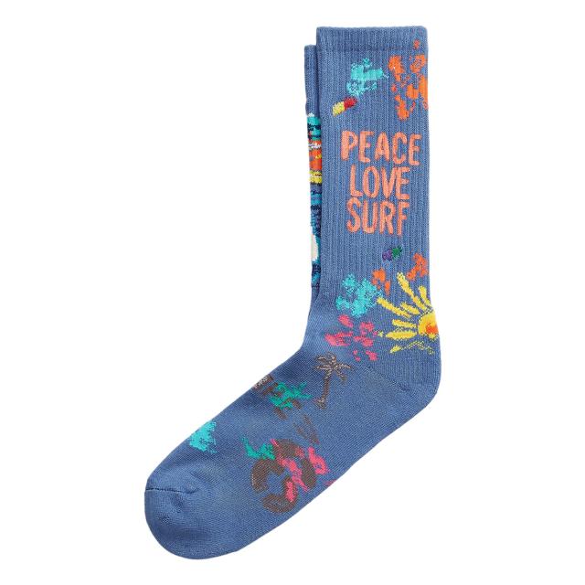 吸湿速乾性のあるコットンブレンド素材で作られたクルーソックス。左右で異なるデザインで、「Peace Love Surf」のカラフルなグラフィックと刺繍が特徴です。