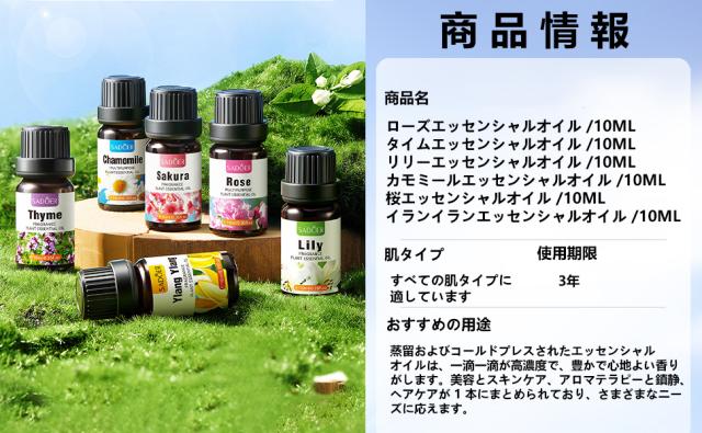 ◎【人気の6種類の花のエッセンシャルオイル】エッセンシャルオイルを生産するために厳格にテストされた原料を使用しており、当社のマルチ香りセットには、桜エッセンシャルオイル、ローズ エッセンシャル オイル、タイムエッセンシャルオイル、リリーエッセンシャルオイル、イランイランエッセンシャルオイル、カモミール エッセンシャル オイルが含まれています。 最も人気のある花とハーブのエッセンシャルオイルです。 理想的なセクシーなマッサージオイルで、カップル間のマッサージに特に適しており、お互いの喜びを高めます。【ボディオイル 良い香り】