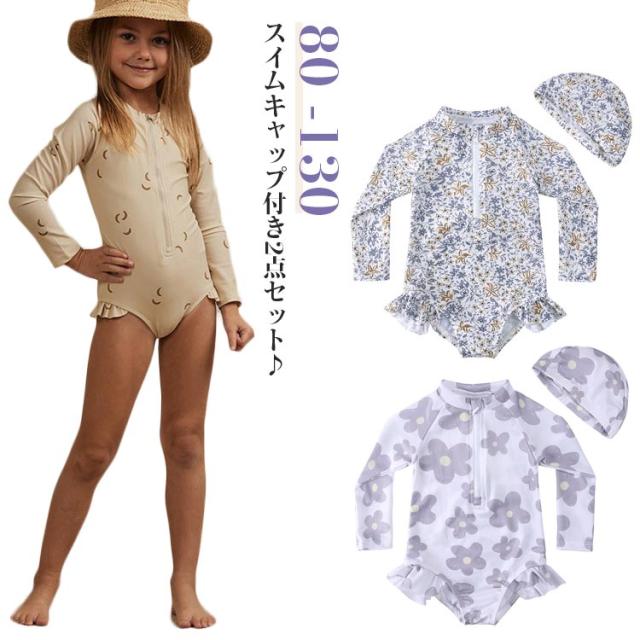 スイムキャップ付き ワンピース 女の子 長袖 2点セット スイムキャップ付き ラッシュガード 小学生 120 水着 子供 80 子ども 100 110 フリル 130 90 キッズ 子供水着 連帯水着 ベビー 赤ちゃん スイムウェア スイミング スーツ 海水浴 川 海 プール 韓国ファッション