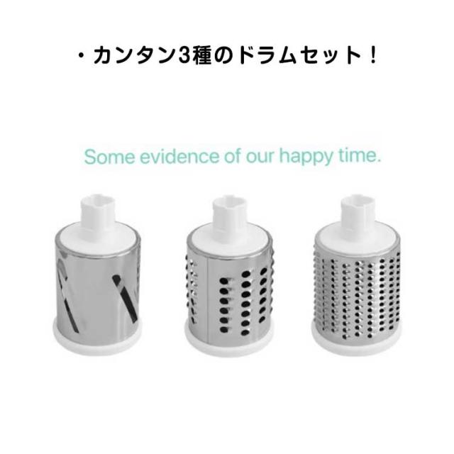 | ・電源いらずで食材を入れてハンドルをくるくる回すだけ! ・カンタン3種のドラムセット! ・調理が苦手な方も、毎日の料理がきっと楽しくなるお助けアイテムです! | |