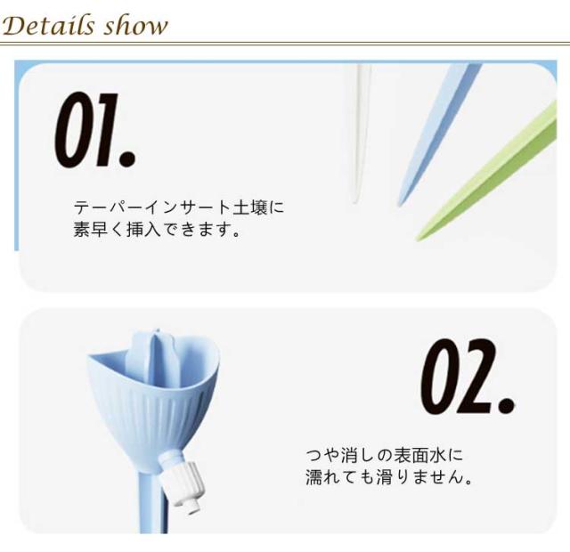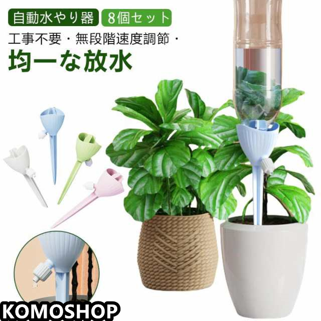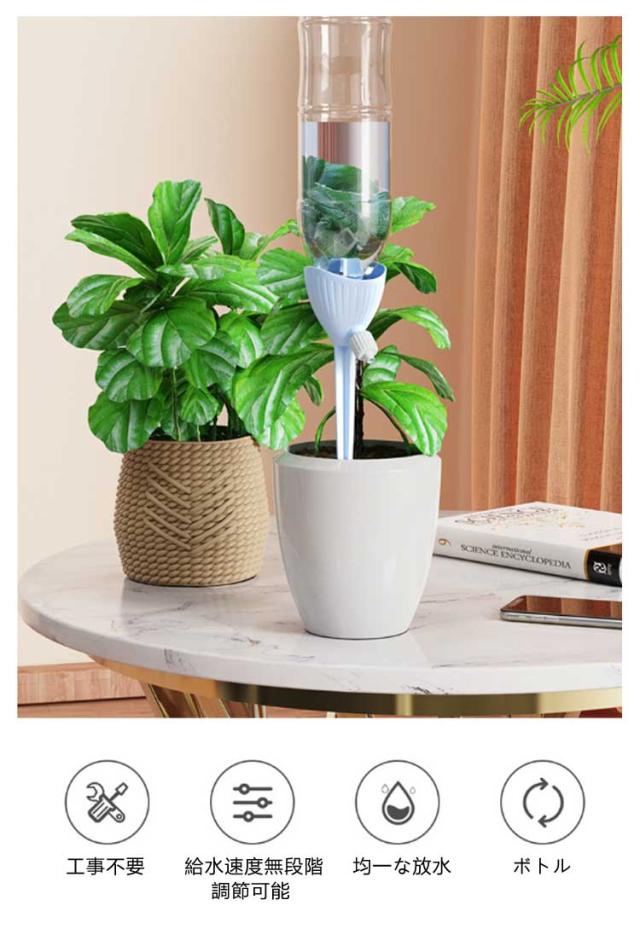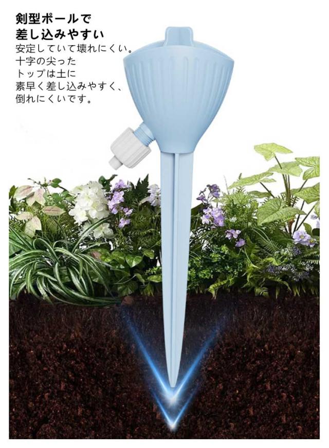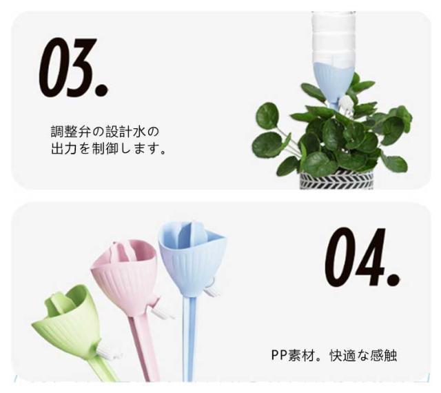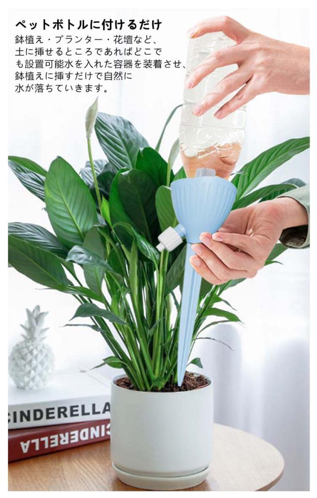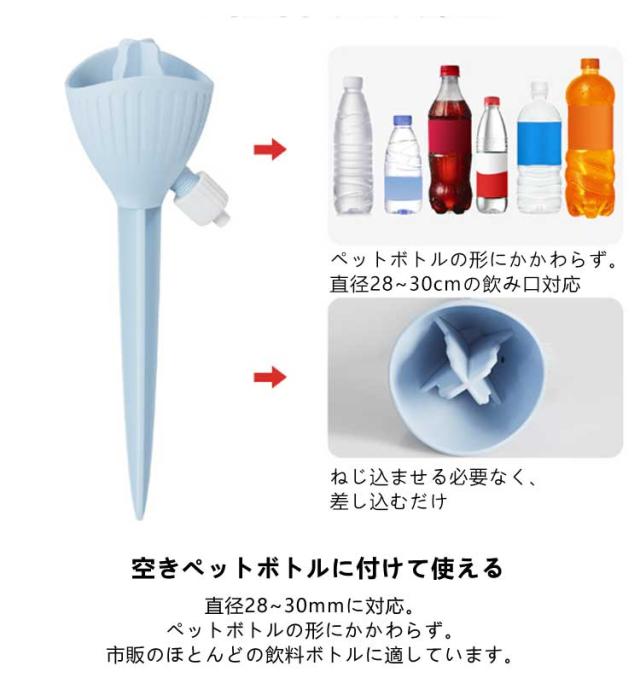 | 工事不要・無段階速度調節・均一な放水 ペットボトルの形にかかわらず 自動水やり器 【8個セット】 ペットボトルで自動給水器に! 忙しい毎日の生活や旅行での水やりに最適な商品です。 ネジの調整で水滴の速度を調整できます。 もう困らない!外出中の水やり簡単! 留守中だけでなく、水が乾きやすい時期の水やり用としても夏場など外でこまめに水を上げるのが大変な時にも役立ちます。 <お勧めポイント> ●無段階速度調節 水やりの量は植物種類と土によって異なるため、違う植物に適度の量をバルブ(給水弁)で調節するこどが可能。 ※旅行など不在中の利用では、事前に必要な水の量など確認してからご使用ください。 その日の気候や植物によって必要な水量は異なってきます。 ●水の出る速さ。均一な水配分。 滴下速度は水圧の影響を受けません。 ●空きペットボトルに付けて使える 直径28~30mmに対応。 ペットボトルの形にかかわらず。 市販のほとんどの飲料ボトルに適しています。 ●剣型ポールで差し込みやすい 安定していて壊れにくい。 十字の尖ったトップは土に素早く差し込みやすく、倒れにくいです。 ●組み立て不要 ペットボトルに取りつけるの自動給水栓 ●ペットボトルに付けるだけ 鉢植え・プランター・花壇など、土に挿せるところであればどこでも設置可能水を入れた容器を装着させ、鉢植えに挿すだけで自然に水が落ちていきます。 <details> ●テーパーインサート土壌に素早く挿入できます。 ●つや消しの表面水に濡れても滑りません。 ●調整弁の設計水の出力を制御します。 ●PP素材。快適な感触 | |