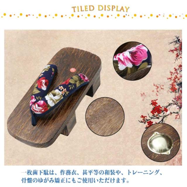 | 一枚歯下駄は、作務衣、甚平等の和装や、トレーニング、骨盤のゆがみ矯正にもご使用いただけます。 しっかりとした太めの桐の歯で、歯裏はゴム底になっています。 鼻緒はハイミロン生地でやわらかく、肌触りも良いです。 | |