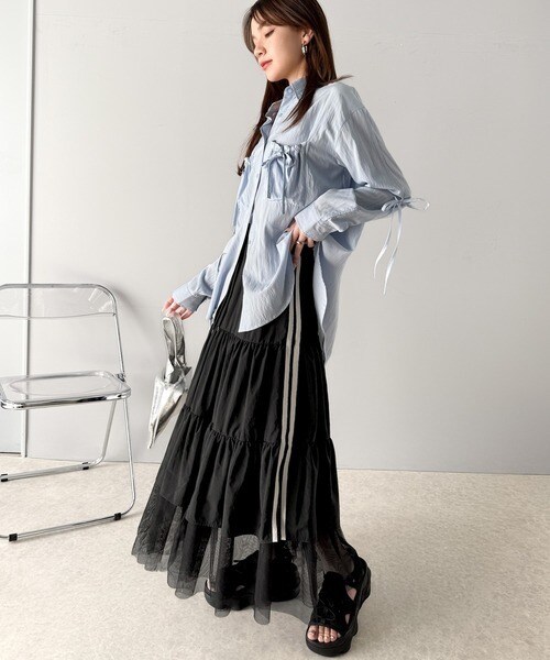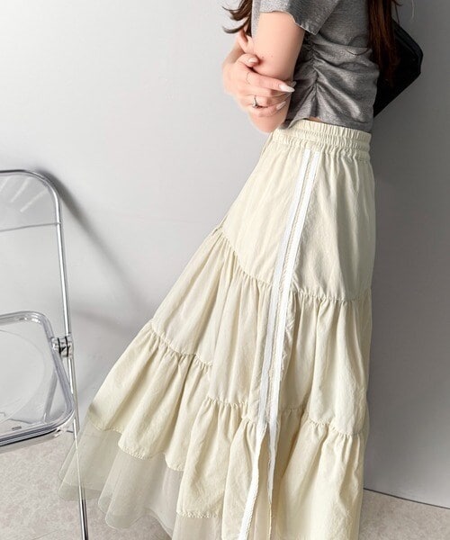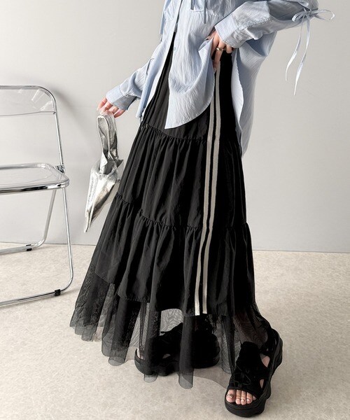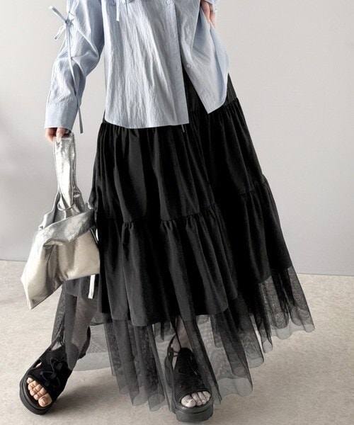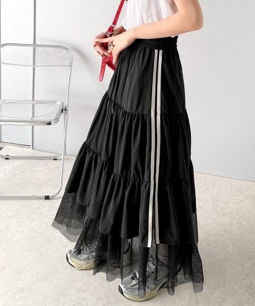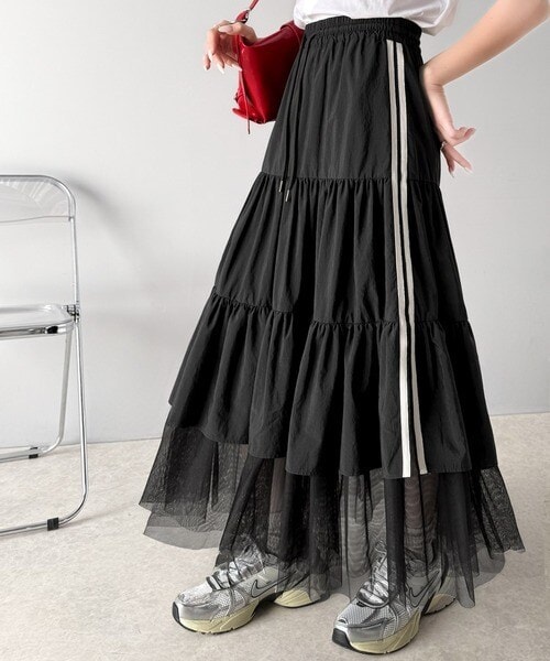 大人の愛されスカート。ナイロンチュールティアード ロングスカート (サイドラインあり・なしタイプ)