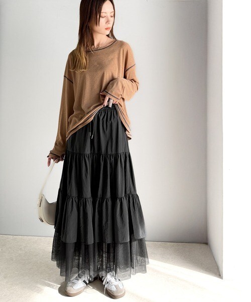 ふわっと揺れるティアードスカートで、上品なカジュアルスタイルを楽しんで♪