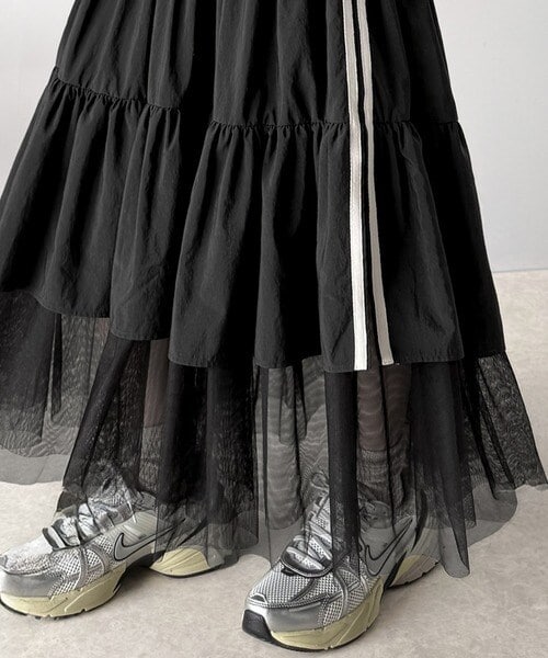 ナイロン生地に柔らかなチュールが組み合わさったティアードスカート。