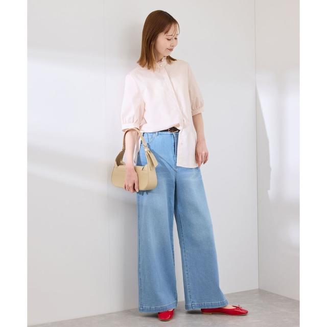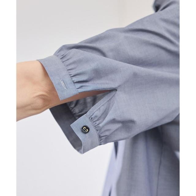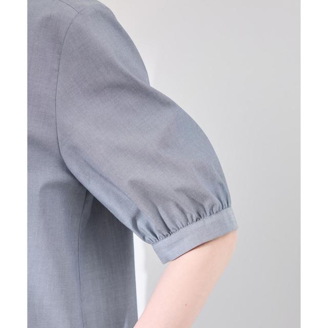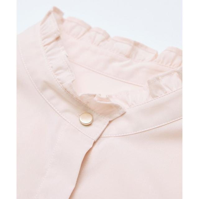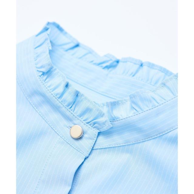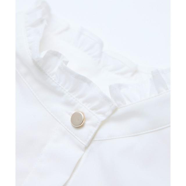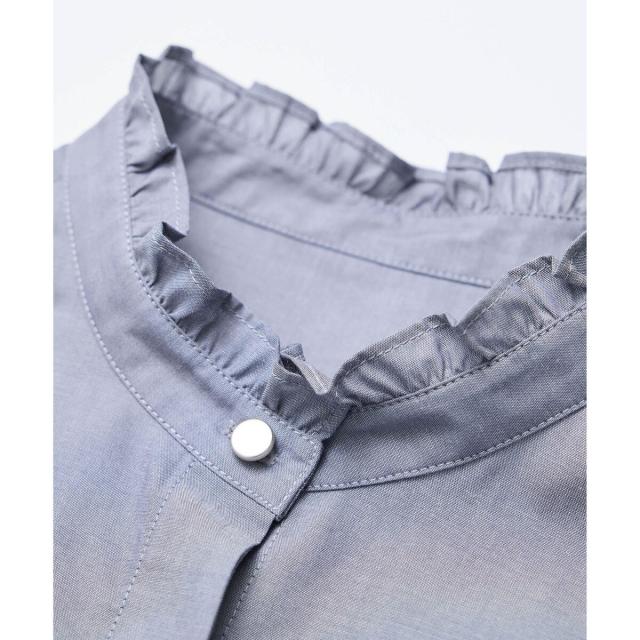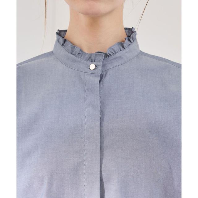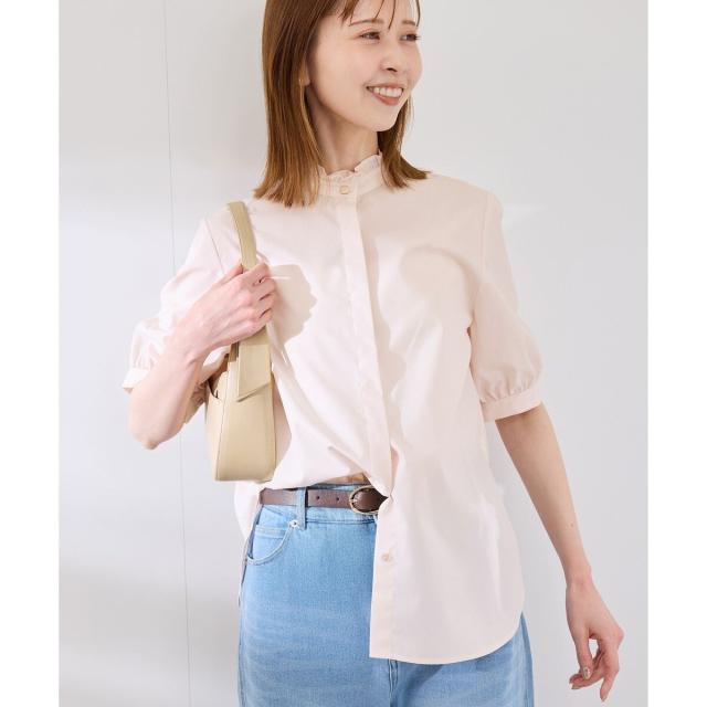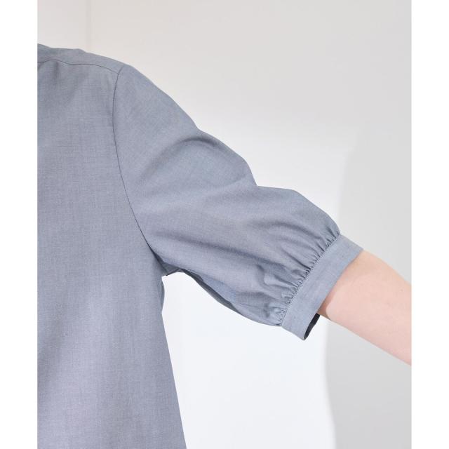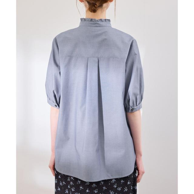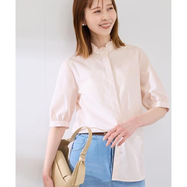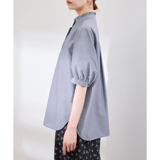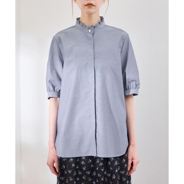 ・コンパクトなスタンドネックにフリルを飾った、ノーブルなハーフスリーブシャツ。