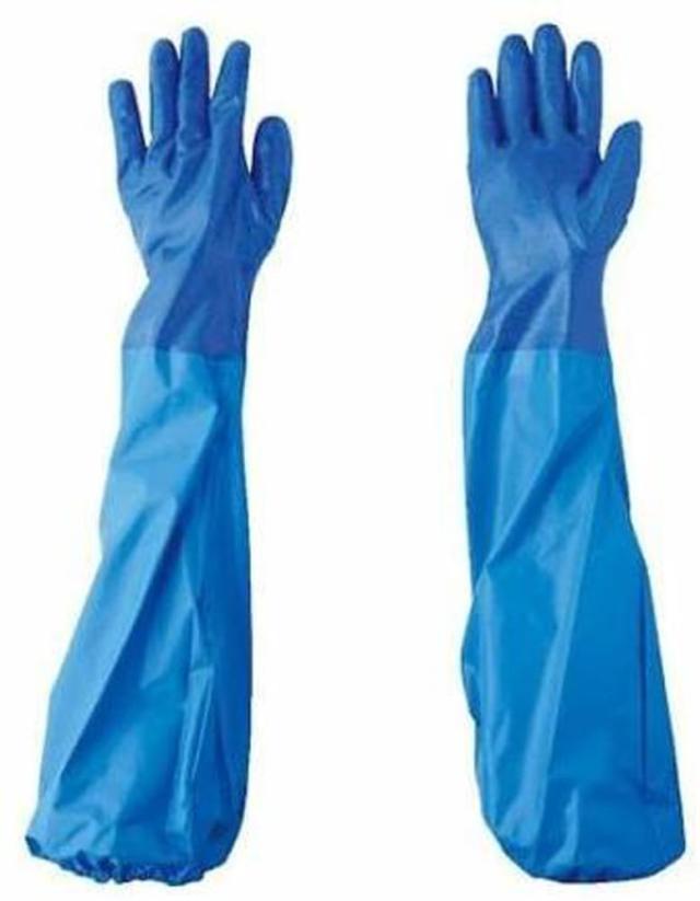 [規格] 食品衛生法適合品 [材質] 手袋表:ニトリルゴム、手袋裏:綿(メリヤス)、腕カバー:ポリエチレン系樹脂 [サイズ] M~LL 長さ60cm [色] ブルー [入数] 1双 [特長] 1)ニトリル手袋の腕カバー付です。 2)手袋部分は、特殊配合のニトリルゴムを使用しており、動植物油に強い耐性があります。 3)手袋部分は厚手タイプ。 [注意点] 回転体に手が巻き込まれる恐れのある作業には絶対使用しないでください。 ※商品のデザイン、仕様、価格等は予告なく変更となる場合がございます。