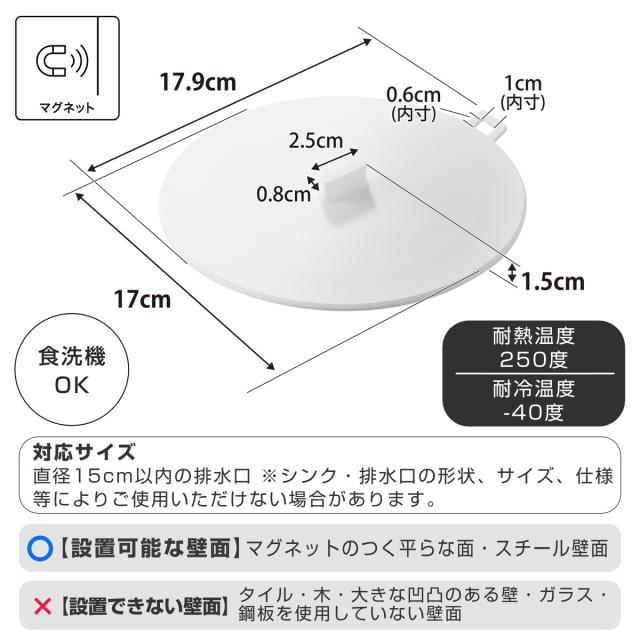 | 対応サイズ | 直径15cm以内の排水口 ※シンク・排水口の形状、サイズ、仕様等によりご使用いただけない場合があります。 |