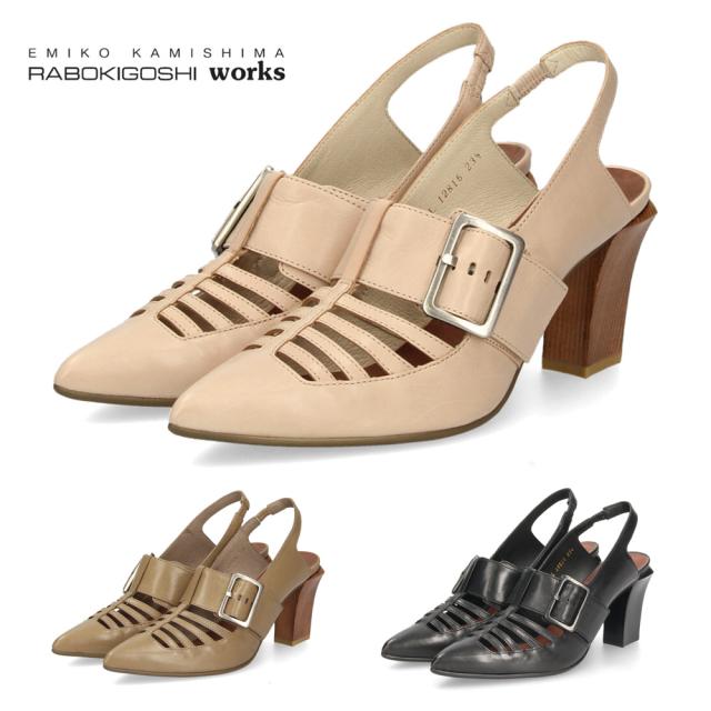 ラボキゴシ ワークス レディース パンプス ストラップ 本革 黒 7.5cm ヒール ポインテッドトゥ トゥバックル付き 12816 RABOKIGOSHI works 日本製