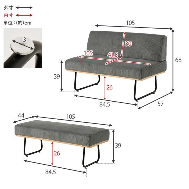 サイズ(約):テーブル:(約)幅110×奥行70×高さ66cm、ソファ:(約)幅105×奥行57×高さ68×座面高39cm、ベンチ:(約)幅105×奥行44×高さ39×座面高39cm