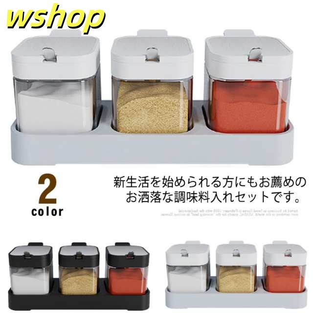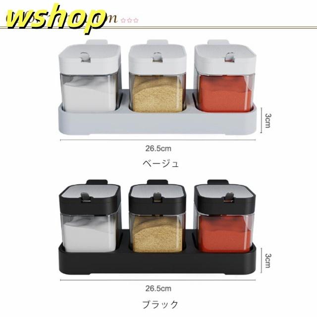 調味料入れ 砂糖入れ 3個セット 調味料ポット 使いやすい ガラス 塩入れ ラック付き 粉末調味料 調味料ケース 保存容器 スプーン付 砂糖ケース 密閉ポット ワンプッシュ キッチン収納 キッチン用品 3個セット 防湿