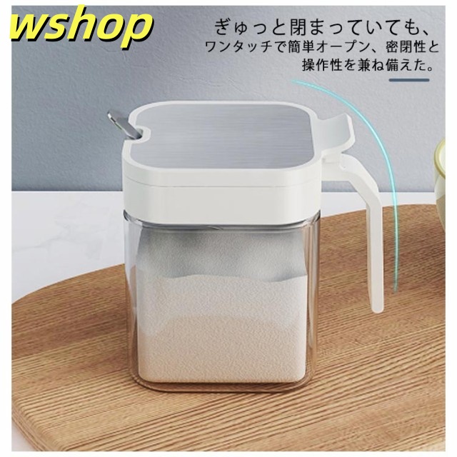 収納便利 売上急増中 キッチン収納 ガラス 調味料ケース キッチン用品 保存容器 使いやすい 密閉ポット 【wshop 砂糖入れ 砂糖ケース 3個セット スプーン付 ワンプッシュ ラック付き 塩入れ 粉末調味料 防湿 調味料ポット 】調味料入れ 今だけ限定