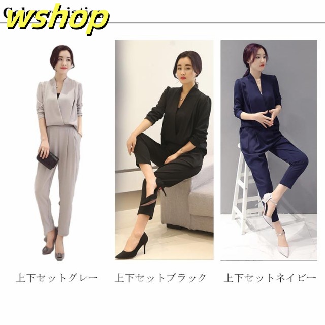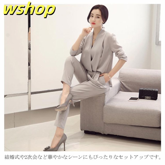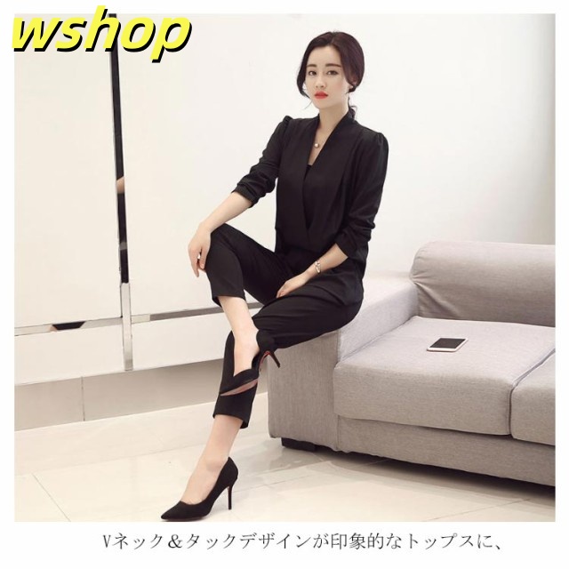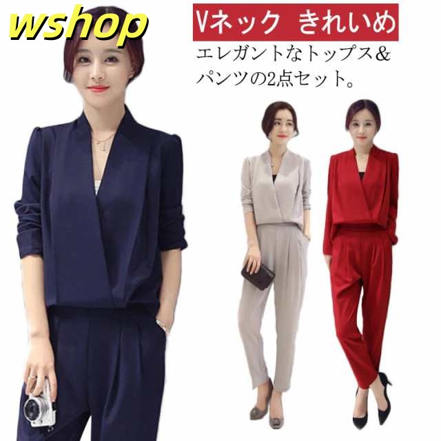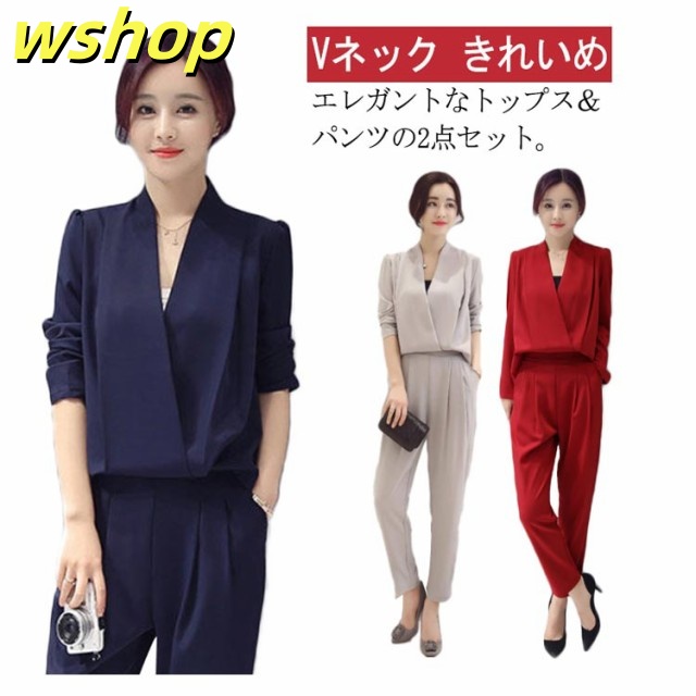 話題商品 SNS話題 フォーマルスーツ およばれ 30代 入園式 スリムパンツ 二次会 Vネック 【wshop 40代 きれいめ 20代 2点セット 卒園式 結婚式 トップス セットアップ 卒業式 】パンツスーツ 長袖 入学式 レディース ママ タック 今だけ限定