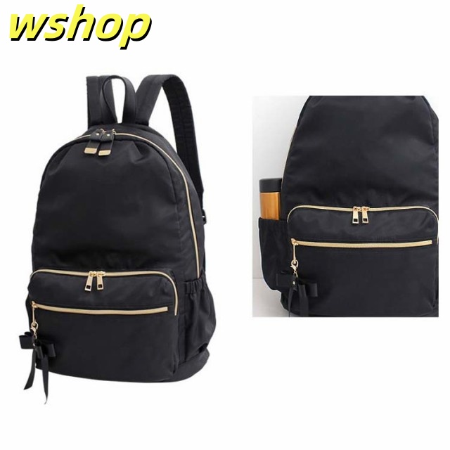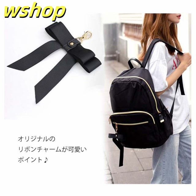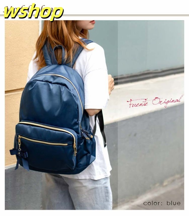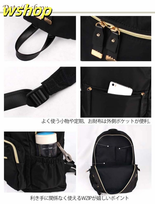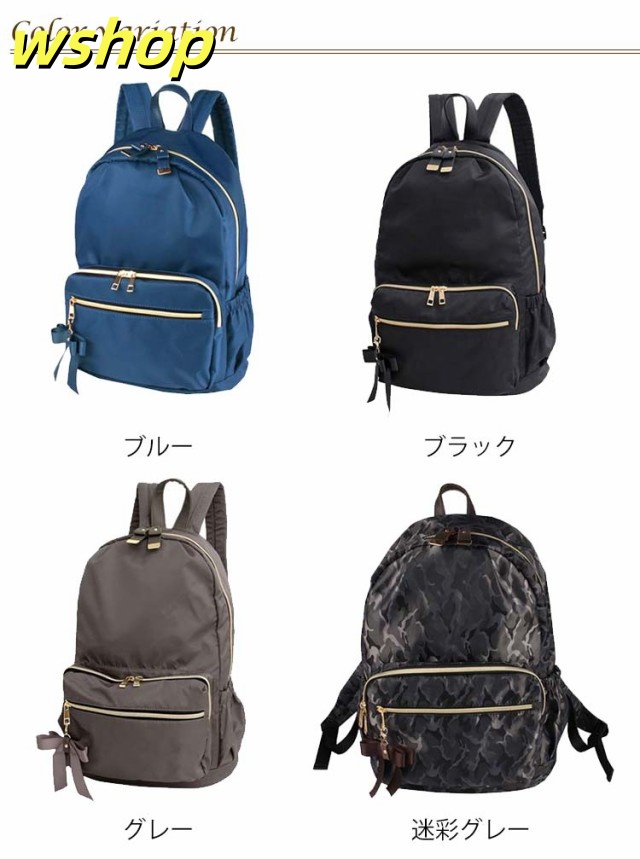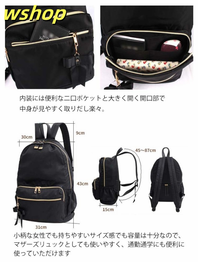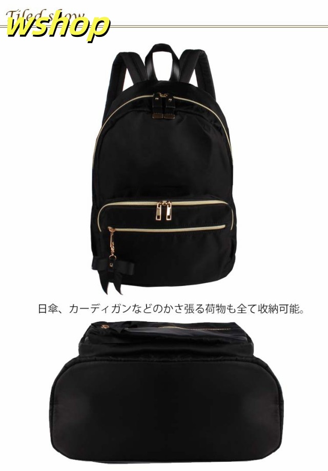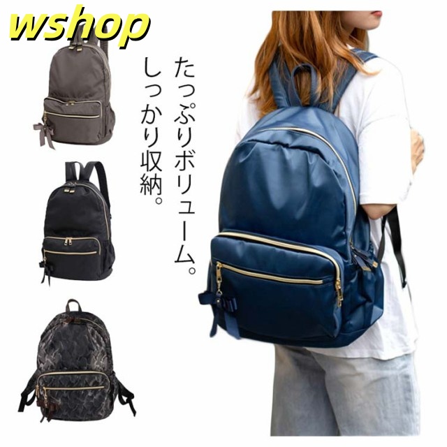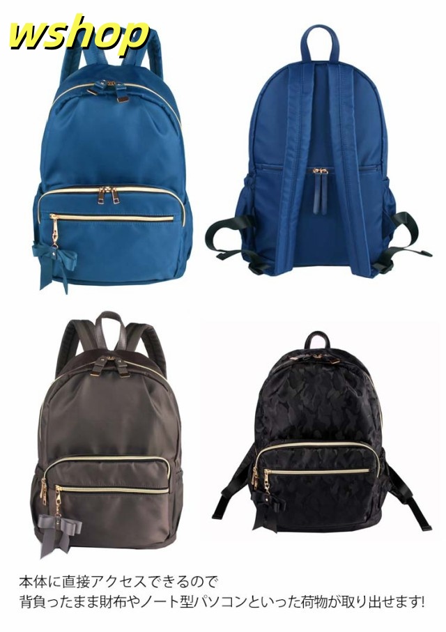 | たっぷりボリューム。しっかり収納。 雑誌、書類、タブレットとママにも嬉しい大容量! 内装には便利な二口ポケットと大きく開く開口部で中身が見やすく取りだし楽々。 日傘、カーディガンなどのかさ張る荷物も全て收納可能。 本体に直接アクセスできるので背負ったまま財布やノート型パソコンといった荷物が取り出せます! よく使う小物や定期、お財布は外側ポケットが便利。 利き手に関係なく使えるWZIPが嬉しいポイント オリジナルのリボンチャームが可愛いポイント♪ 小柄な女性でも持ちやすいサイズ感でも容量は十分なので、マザーズリュックとしても使いやすく、通勤通学にも便利に使っていただけます | |