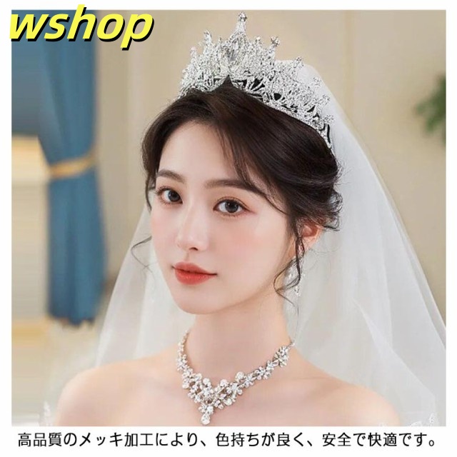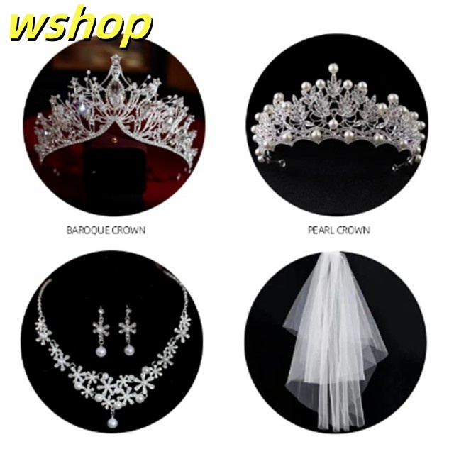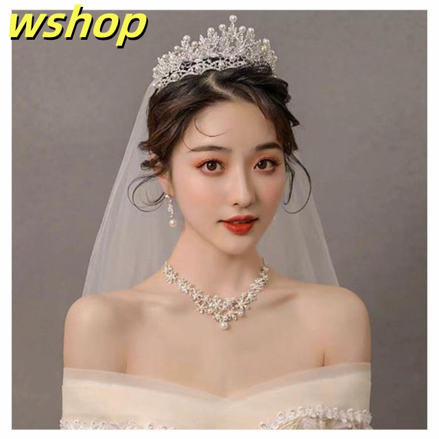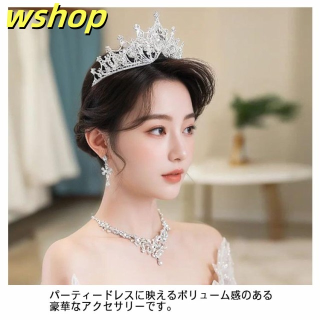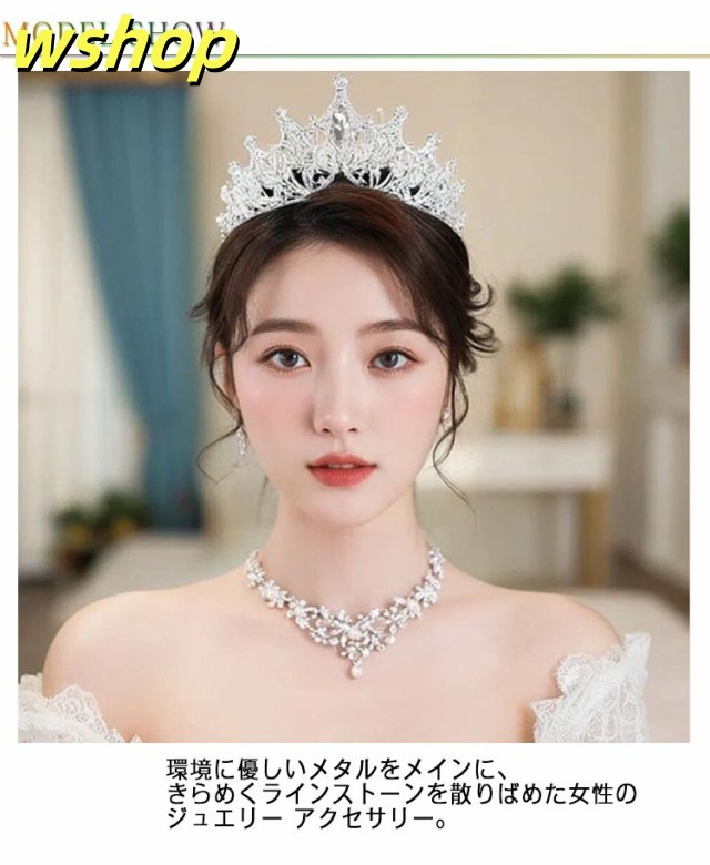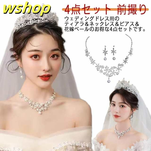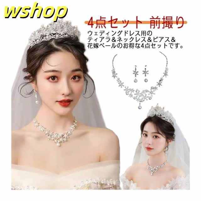 【wshop 】結婚式 アクセサリー 4点セット ティアラ イヤリング ネックレス ピアス 花嫁ベール ヘッドアクセ パーティー ウェディング 二次会 前撮り 発表会 卒業式 ヘッドドレス ブライダルジュエリー ブライダル ヘアアクセサリー 髪飾り カチューシャ