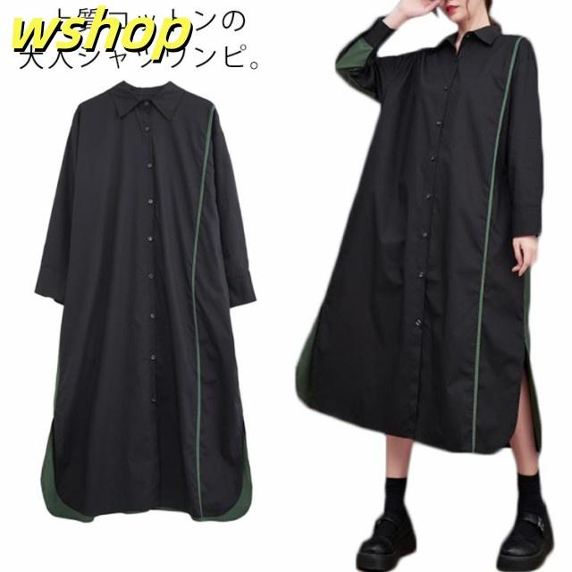 シャツワンピース ワンピース レディース 送料無料 切り替え スリット入り ロングワンピース ブラック 黒 フレアワンピース Aラインワンピース オーバーサイズ 大人 おしゃれ 30代 40代 50代 60代 春 夏 秋