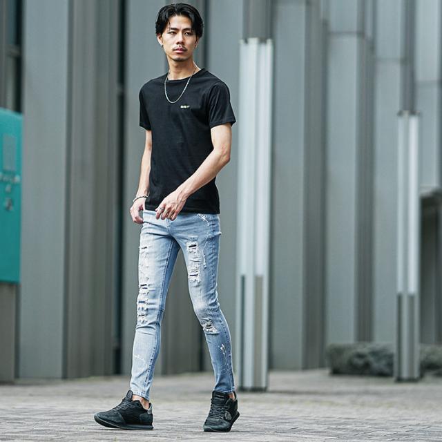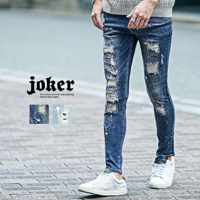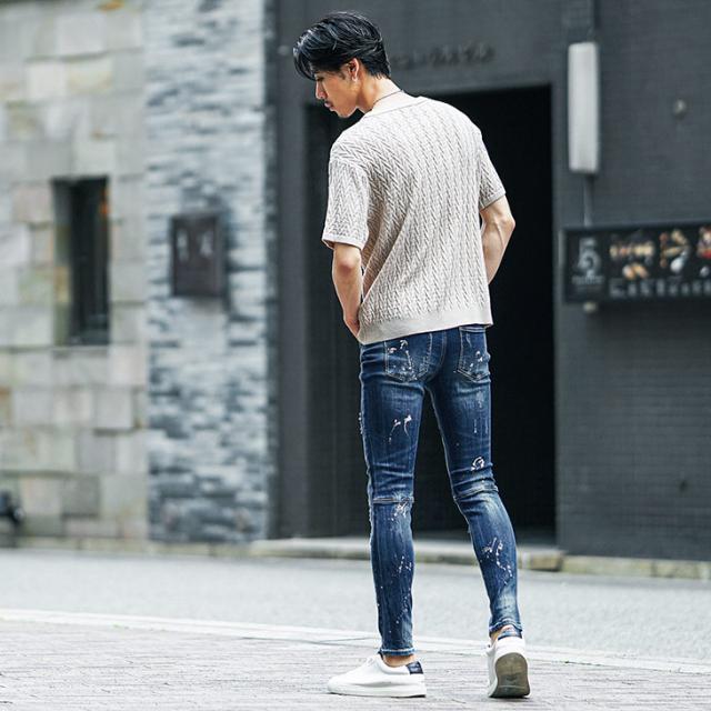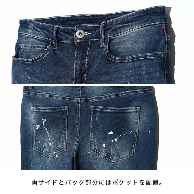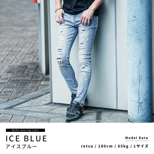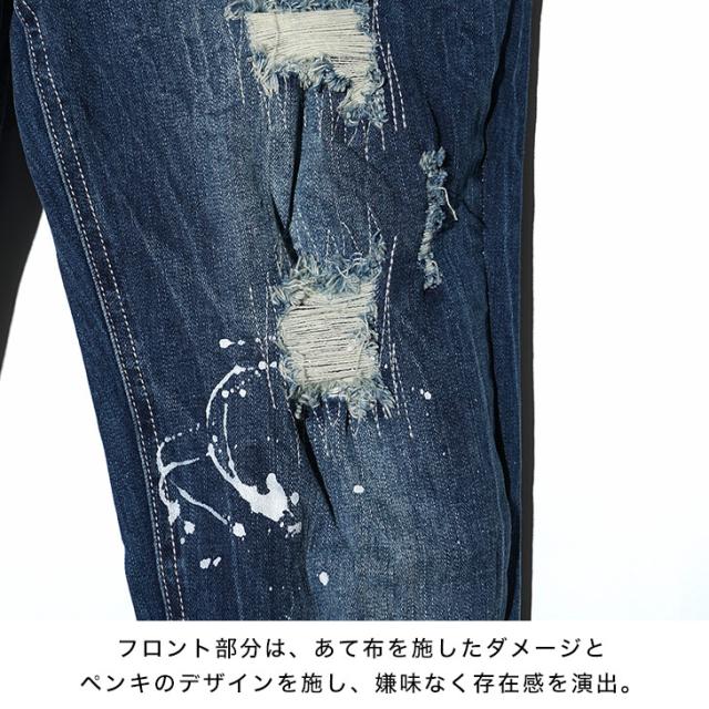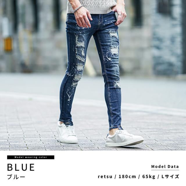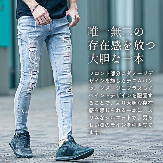 ペインティングデニム メンズ ジーパン メンズ スキニーデニム メンズ ダメージデニムパンツ メンズ ジーンズ スキニー リペアデニム ダメージジーンズ ストレッチ パンツ 細身 インディゴ 夏 夏服 夏物 春夏 メンズファッション ちょいワル お兄系 オラオラ系