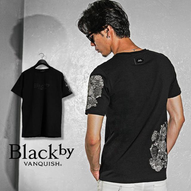 Tシャツ メンズ 半袖 細身 黒Tシャツ メンズ ブランド 半袖tシャツ メンズ クルーネック 刺繍 フラワー柄 ロゴTシャツ メンズ スリム 夏 夏服 夏物 メンズファッション ちょいワル Black by VANQUISH ブラックバイヴァンキッシュ
