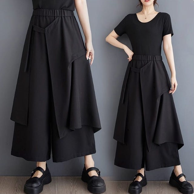 個性的な切り替えアシンメトリーデザインのワイドパンツ。