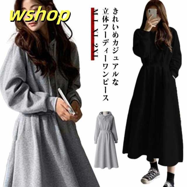 【wshop 】ワンピース 長袖 秋 冬 秋冬 春 パーカー パーカーワンピース ロング丈 カジュアル スウェット ワンピース ロング スウェットワンピース ポケット付き ウエストシェイプ ハイウエスト タック ミモレ丈 楽ちん Aライン 落ち感 リラックス 黒 ブラック グレー