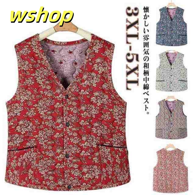即納OK SNS話題 キルティングベスト 中綿入り キルト 和柄 前開き 花柄 ポケット付き チョッキ 】レディース 防寒 暖かい 和柄キルトベスト 【wshop コート Vネック シニア インナー ベスト おばあちゃん 秋冬 ノースリーブ あったか 母 送料無料