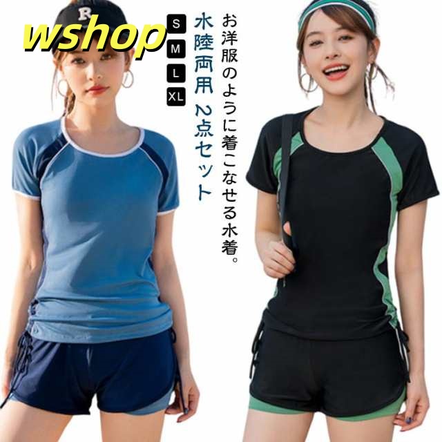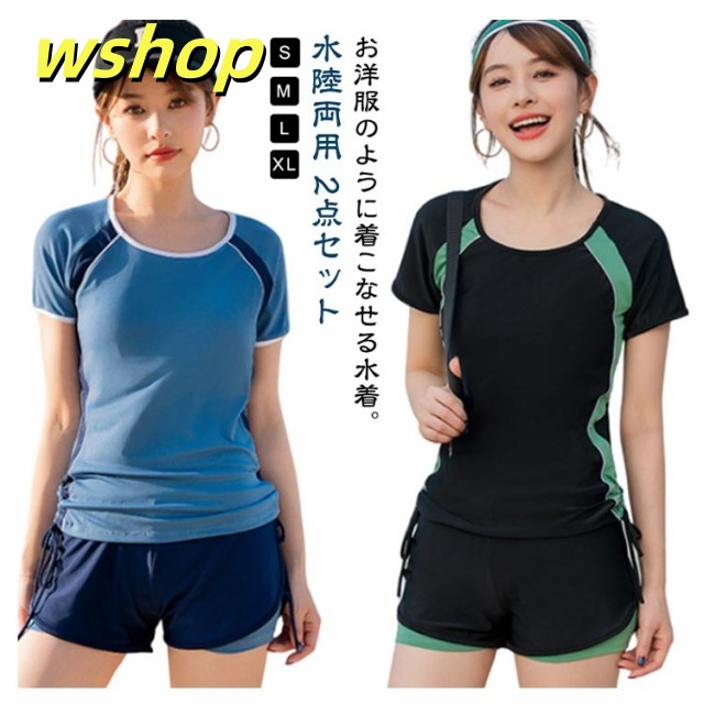 レディース 水着 高校生 ママ水着 体型カバー水着 40代 大学生 ラッシュガード 20代 30代 中学生 レディース セパレート レイヤード風 ショートパンツ スポーティー 上下セット 胸パッド付き 露出控えめ ライン入り