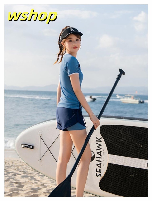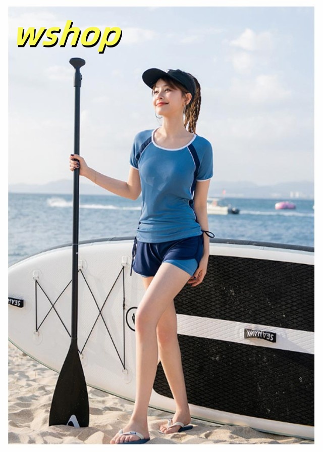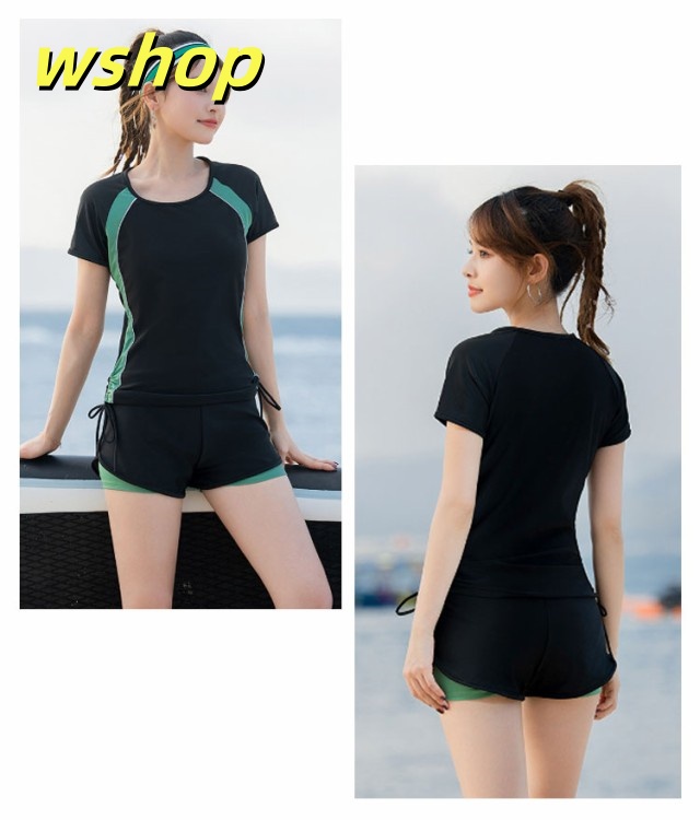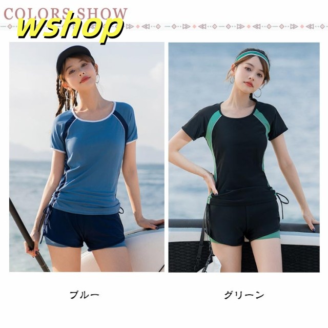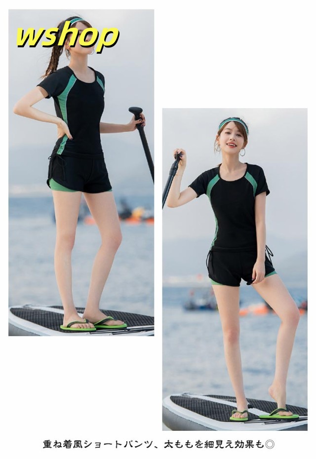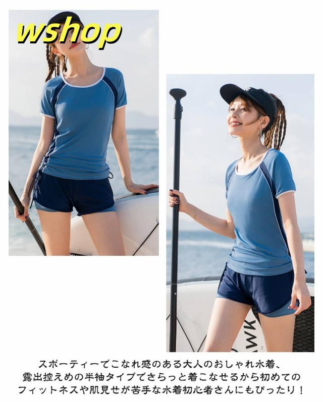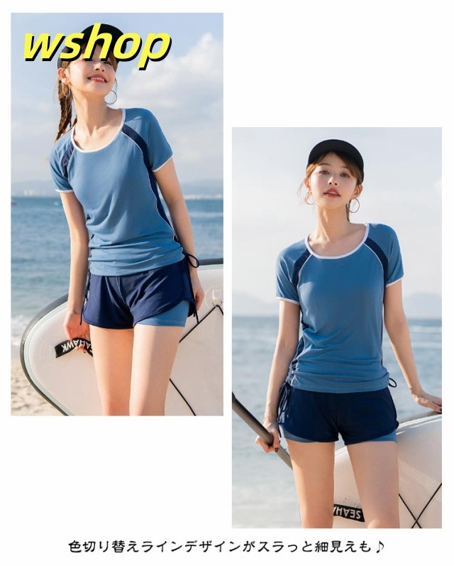 人気急上昇 売上急増中 20代 【wshop セパレート 体型カバー水着 ラッシュガード ショートパンツ ママ水着 レイヤード風 】レディース 露出控えめ 中学生 高校生 胸パッド付き 水着 40代 ライン入り 大学生 30代 上下セット スポーティー レディース 在庫わずか