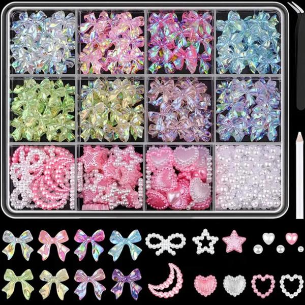 12 グリッド/ボックス混合樹脂ちょう結びネイルチャーム 3D カラフルな弓かわいいラインストーンネイルアート装飾 DIY マニキュアパーツペンピンセット