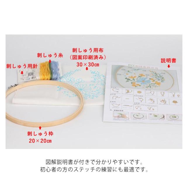 | サイズについての説明 | 【キット内容】 ・刺しゅう用布(図案印刷済み) ・刺しゅう糸 ・刺しゅう用針 ・刺しゅう枠 ・図解説明書 |