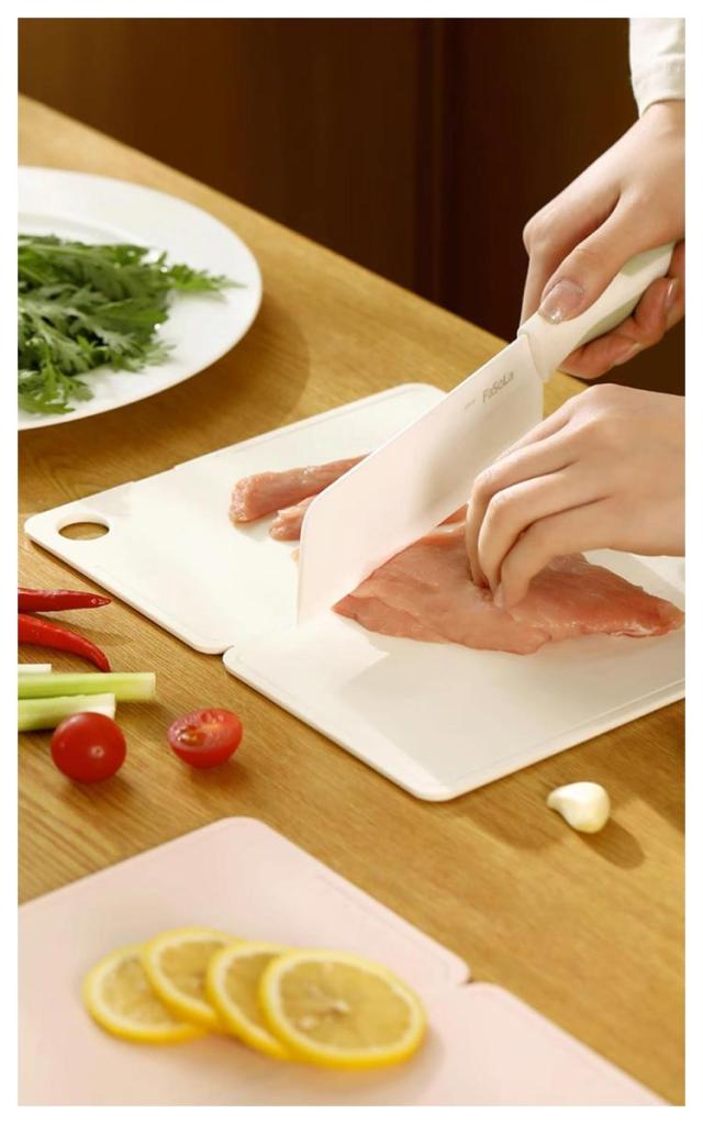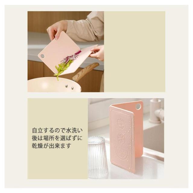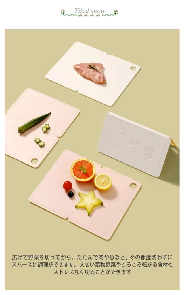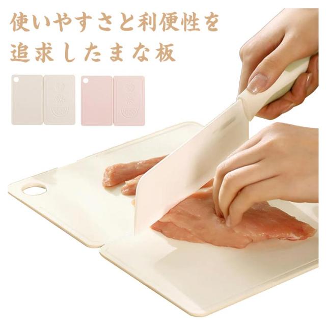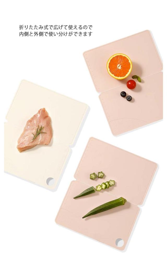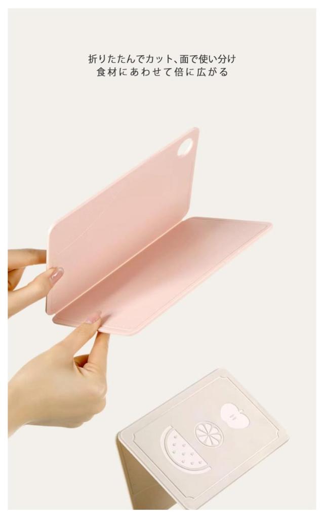 | 使いやすさと利便性を追求したまな板 折りたたんでカット、面で使い分け。食材にあわせて倍に広がる。 折りたたみ式で広げて使えるので、内側と外側で使い分けができます。 広げて野菜を切ってから、たたんで肉や魚など、その都度洗わずにスムースに調理ができます。大きい葉物野菜やころころ転がる食材もストレスなく切ることができます。 抗菌仕様で衛生的。折りたたんでも薄さ8mmなので、収納にも困りません。 自立するので水洗い後は場所を選ばずに乾燥が出来ます。 | |