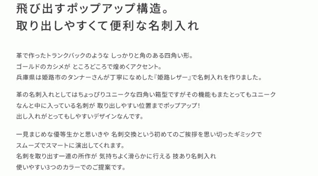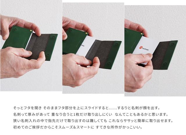 中に入っている名刺が 取り出しやすい位置までポップアップ!名刺を取り出す一連の所作が 気持ちよく滑らかに行える 技ありアイテムです。