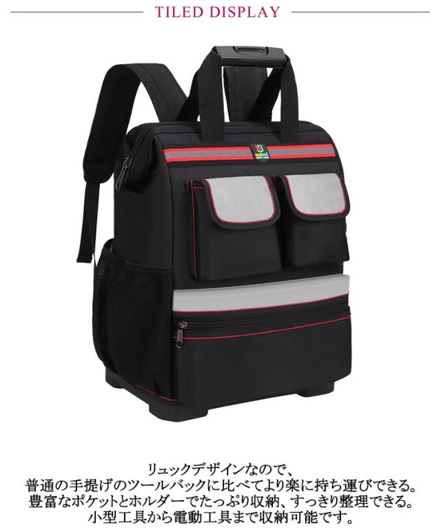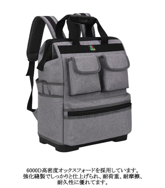 | リュック型大容量ツールバッグ。【強化底部、自立機能】【15ポケット】 リュックデザインなので、普通の手提げのツールバックに比べてより楽に持ち運びできる。 豊富なポケットとホルダーでたっぷり収納、すっきり整理できる。小型工具から電動工具まで収納可能です。 6000D高密度オックスフォードを採用しています。強化縫製でしっかりと仕上げられ、耐荷重、耐摩擦、耐久性に優れてます。 バックパネルやショルダーストラップは幅を広め、柔らかなパッドが付いて、優れた減圧効果があり、長時間に重い工具を負担しても疲れにくいです。また、通気性が高い、汗などを速やかに吸収できます。暑い日でも快適に背負います。 工具入れバッグは様々な道具や工具の収納、携帯に、仕切りがついており大変便利です。ガーデニング、釣り、工芸、建築、大工、請負業者、屋根、ラインマン、石工、鉄工などの作業を携わる人に最適にします。日常生活のDIY活動だけでなく、自動車修理、木工および専門な修理活動も最適です。 | |