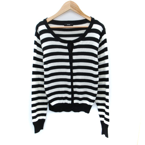 【中古】エモダ EMODA ニットカーディガン ミドル丈 ラウンドネック ボーダー柄 F 黒 ブラック 白 ホワイト