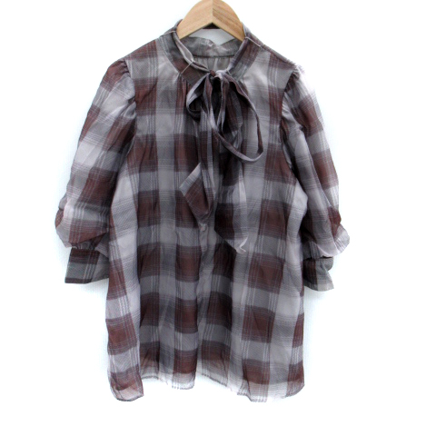 【中古】ナイスクラップ NICE CLAUP シャツ ブラウス 七分袖 ボウタイ チェック柄 F グレー 茶 ブラウン レディース